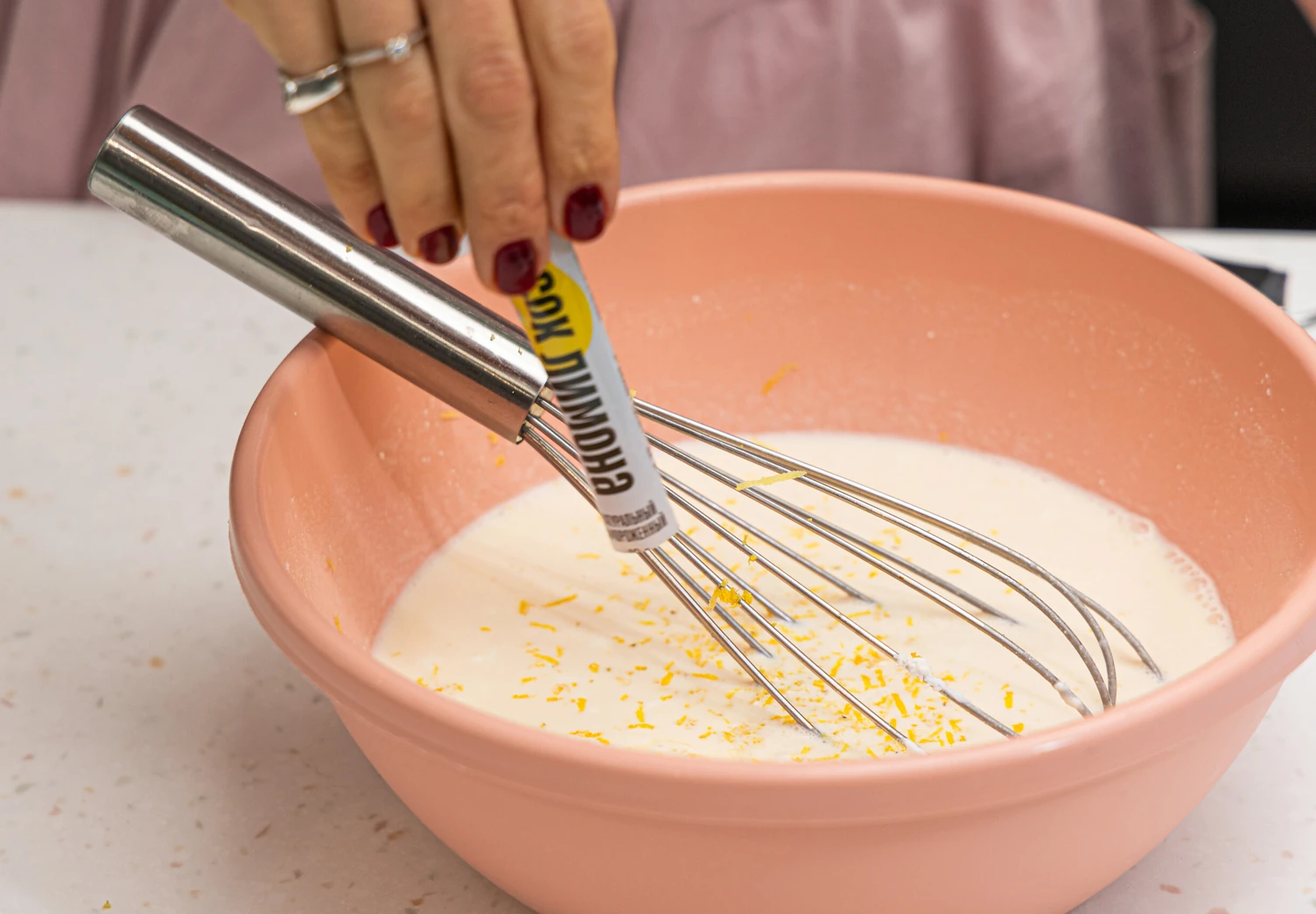 Добавьте яйца, лимонный сок и цедру, перемешайте всё до однородности.