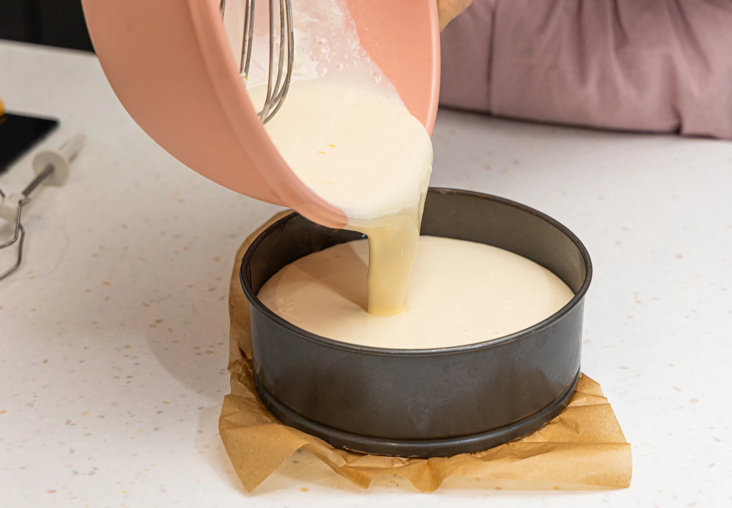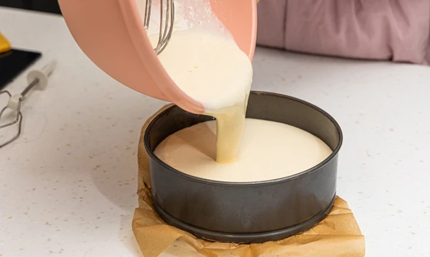 Выпекайте 40–45 минут. Края должны схватиться, а центр — слегка подрагивать. Остудите готовый чизкейк сначала при комнатной температуре, затем уберите в холодильник минимум на 2–3 часа.