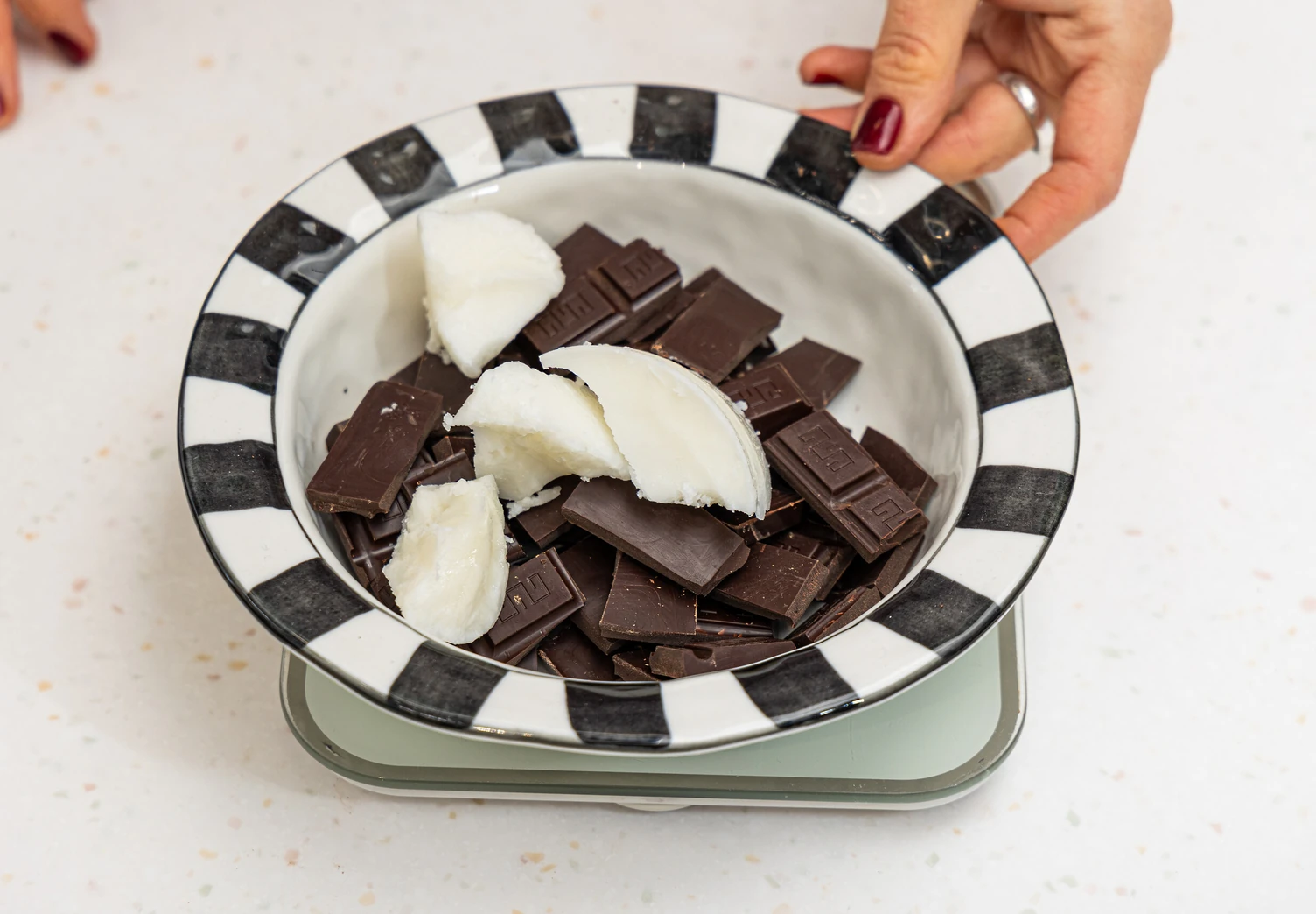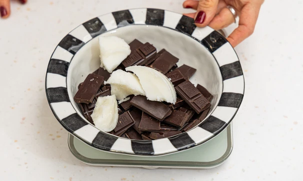 Растопите шоколад вместе с кокосовым маслом на водяной бане или короткими импульсами по 15–20 секунд в микроволновке.