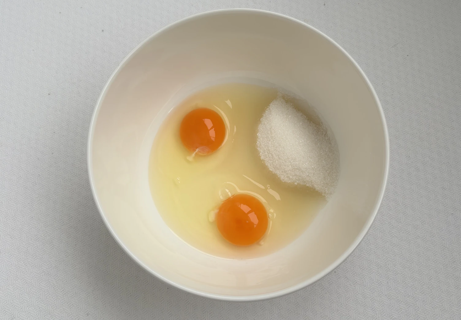В миску разбейте яйца и всыпьте сахар. Взбейте яйца на максимальной скорости миксера до светлой пышной пены. На это уйдет 6-7 минут.