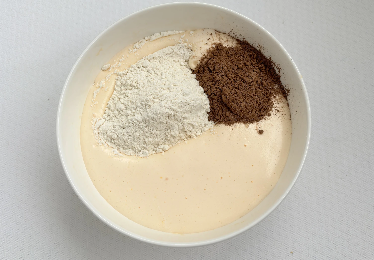 Добавьте в тесто разрыхлитель, какао и муку. Аккуратно вымесите довольно густое тесто.