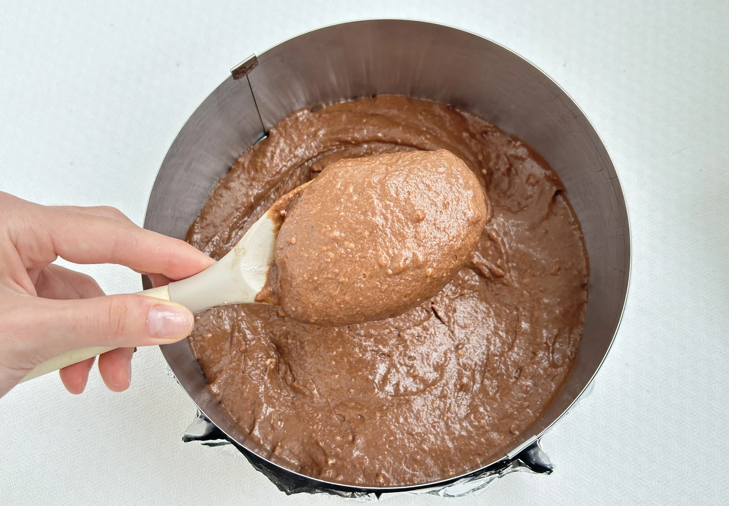 Застелите форму диаметром 22 см фольгой или пергаментом для выпечк, смажьте немного маслом и и вылейте тесто. Отправьте бисквит в духовку на 25-30 минут при 180 градусах.
