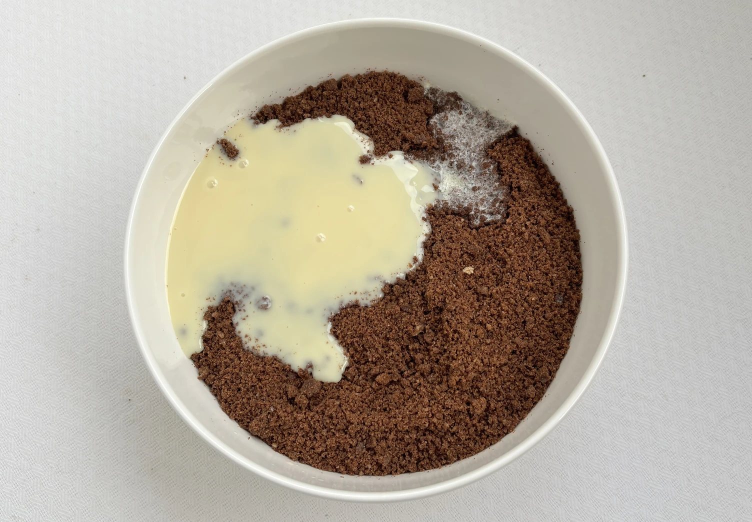 В измельченный бисквит влейте сгущённое молоко и растопленное сливочное масло. Перемешайте массу руками: она должна получиться достаточно плотной и легко поддающейся лепке.