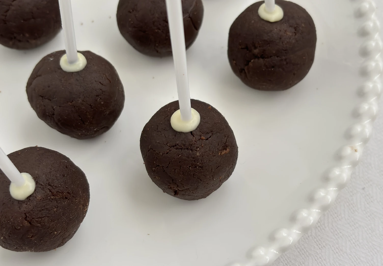 Растопите 10 г белого шоколада на водяной бане или короткими импульсами в микроволновке. Кончики палочек для кейк-попсов обмакните в шоколад и вставьте в шарики. Оставьте кейк-попсы в холоде на 20-30 минут.