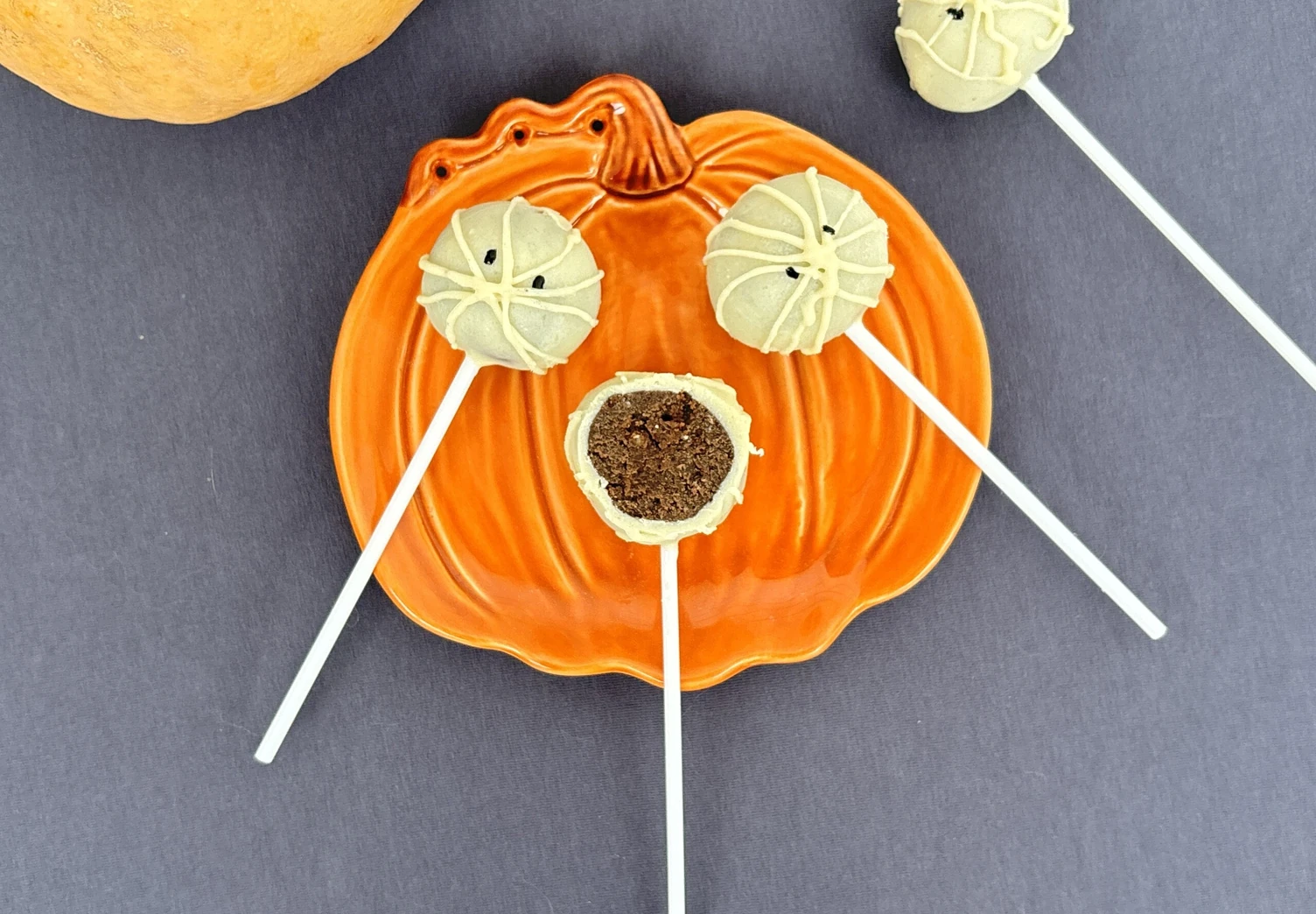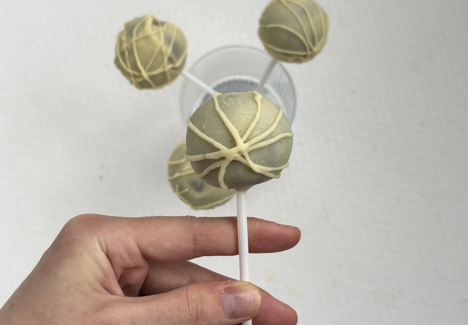 Растопите 25 г шоколада и перелейте его в кондитерский мешок. Сделайте небольшое отверстие и выдавливайте шоколад из мешка вкруговую, создавая «паутину». Отправьте кейк-попсы в холод на 30-40 минут.