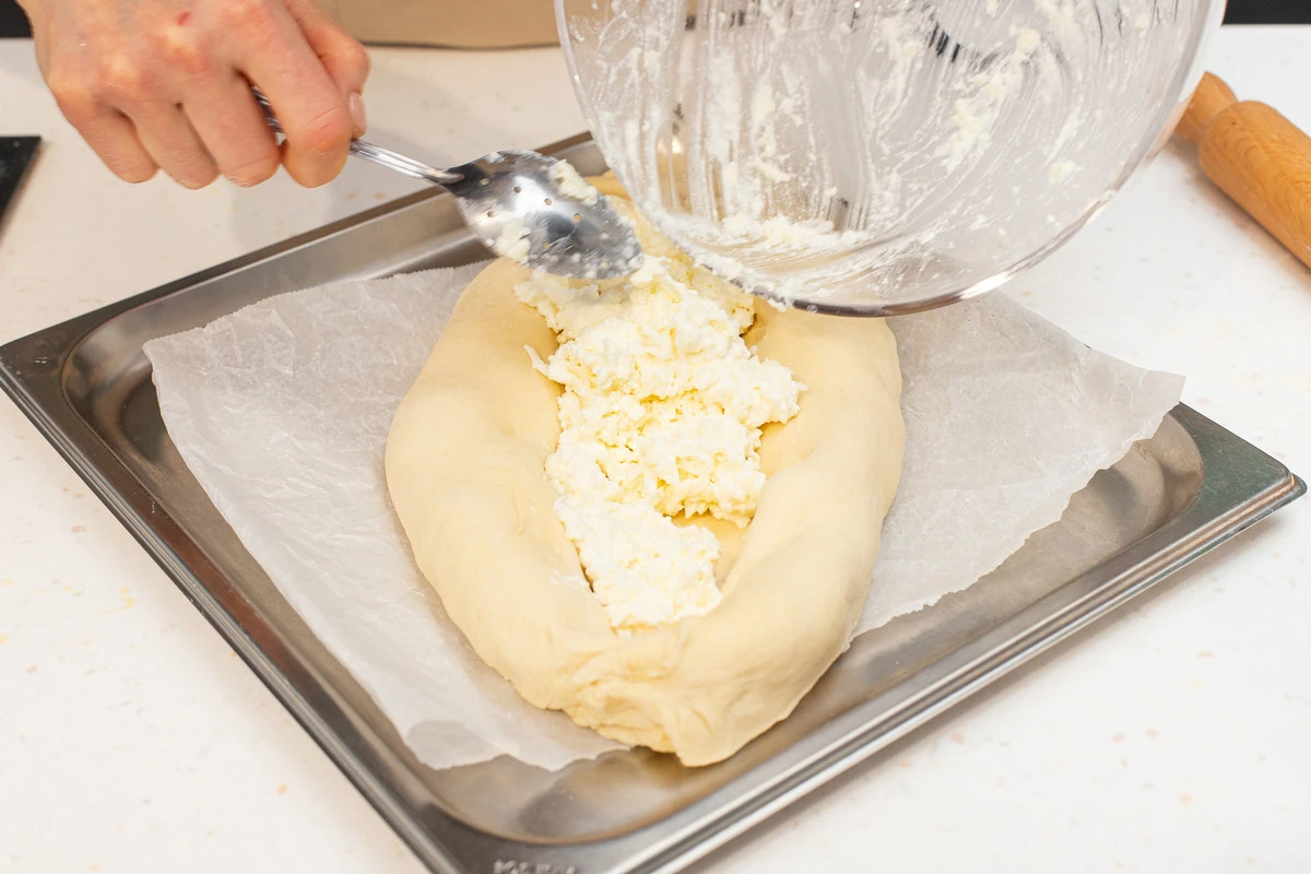 По краям длинных сторон пласта выложите по ⅓ начинки.
