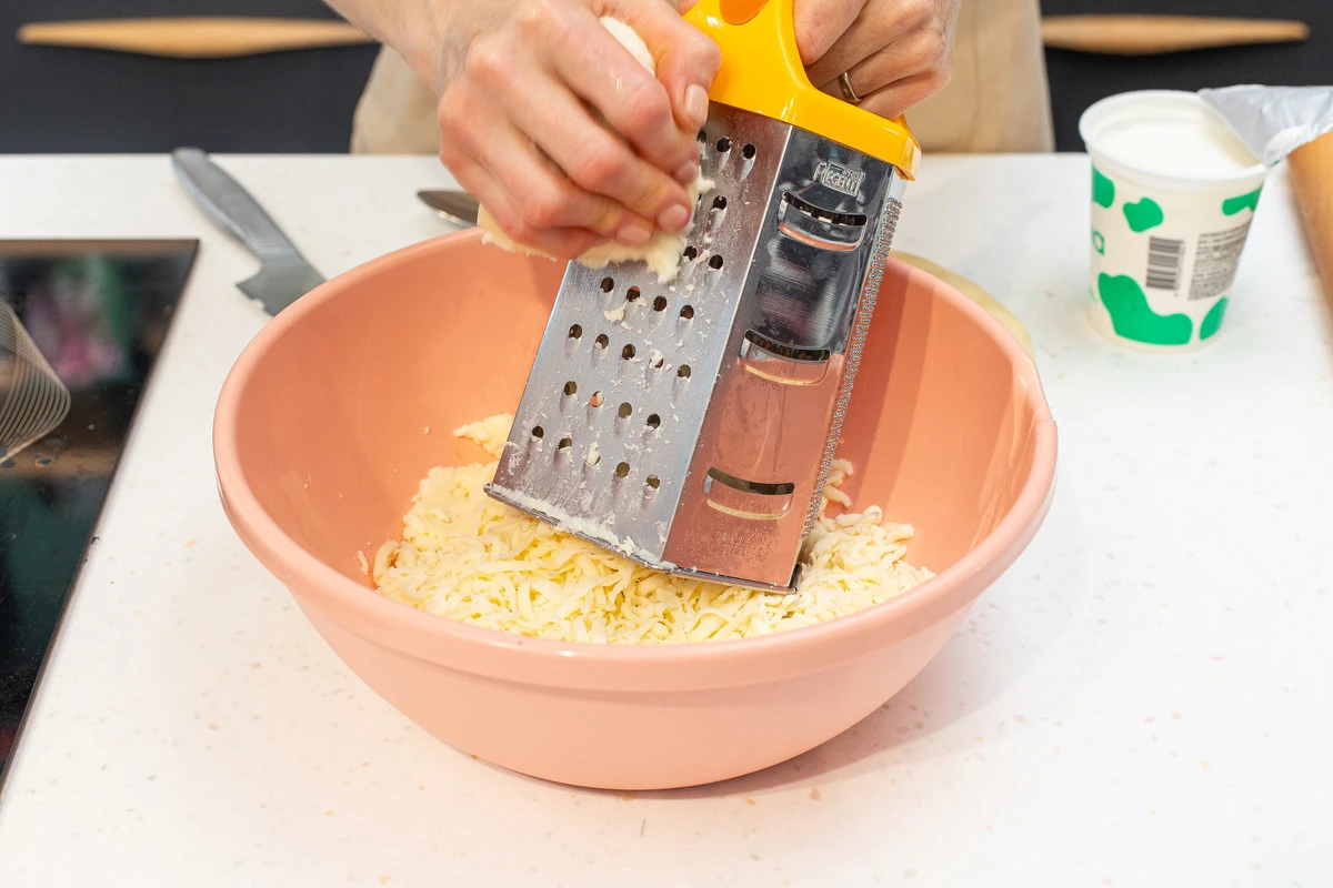 Разморозьте тесто согласно инструкции на упаковке. Сыр измельчите на крупной тёрке.