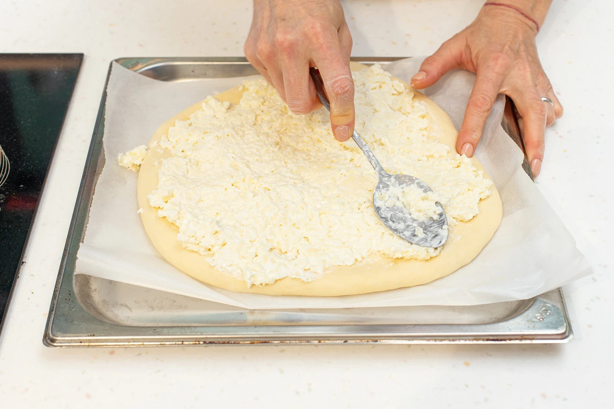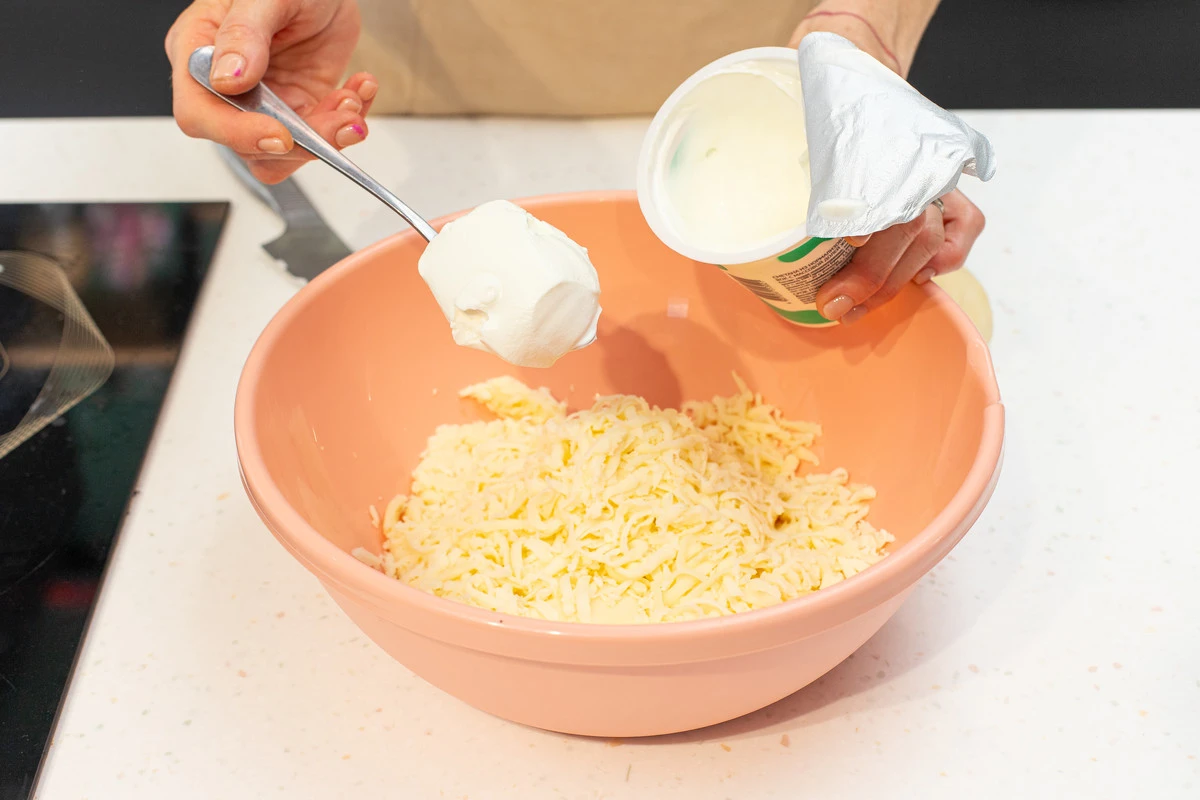 Совет: Если любите выпечку, в которой много сыра, можете увеличить количество сулугуни до 400 г, сметаны — до 3 ст. л. При этом внутрь положите примерно 2/3 начинки, а наверх — около 1/3.