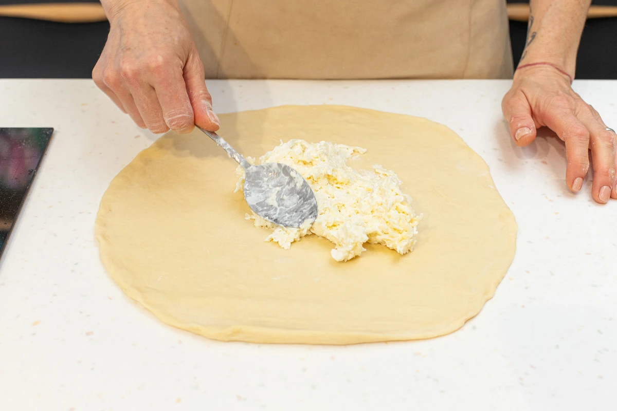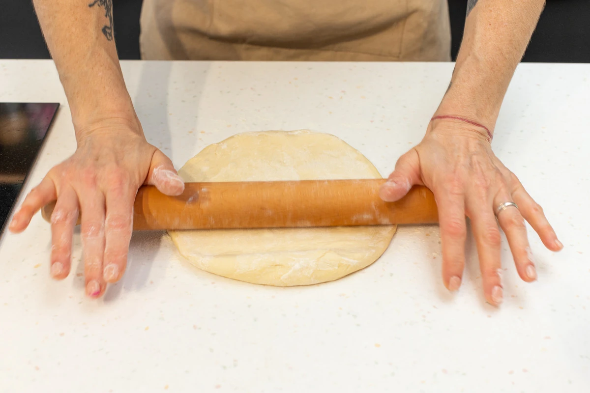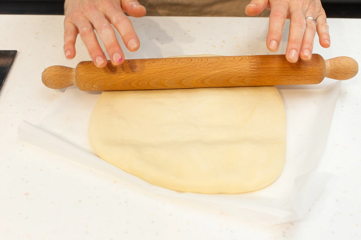 Положите заготовку на пергамент для выпечки защипами вниз и скалкой раскатайте в круглую лепёшку.