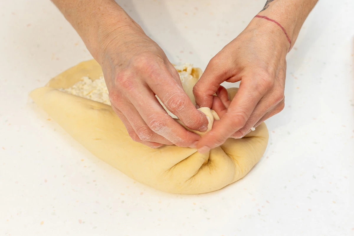 Защипните края, собрав их к центру лепёшки, и хорошо закрепите. Начинку не должно быть видно.