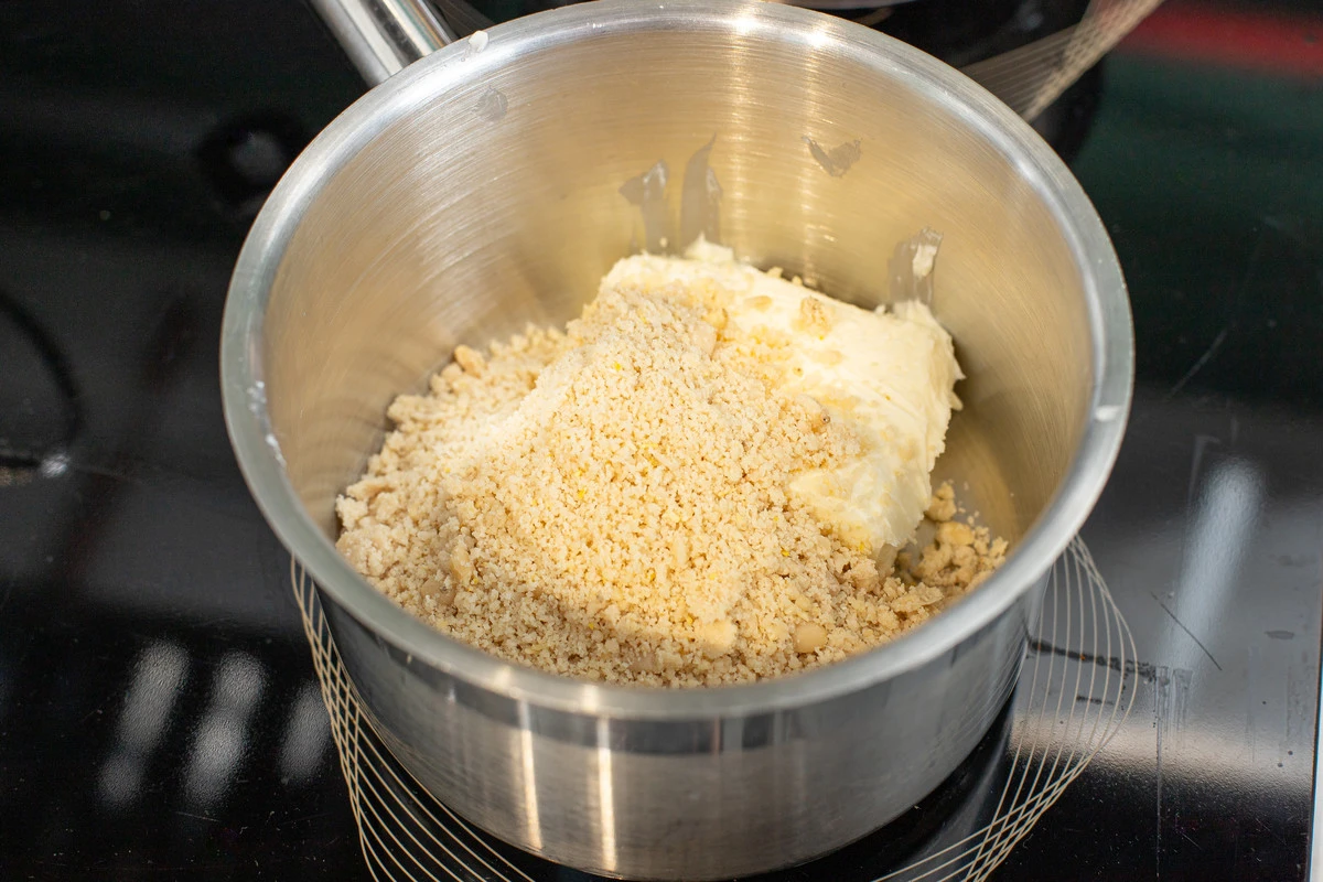 В сотейнике или сковороде с толстым дном соедините сливочное масло с орехами. Натрите лимонную цедру, всыпьте манную крупу. Обжарьте всё вместе, размешивая, до золотистого цвета, около 5-7 минут.