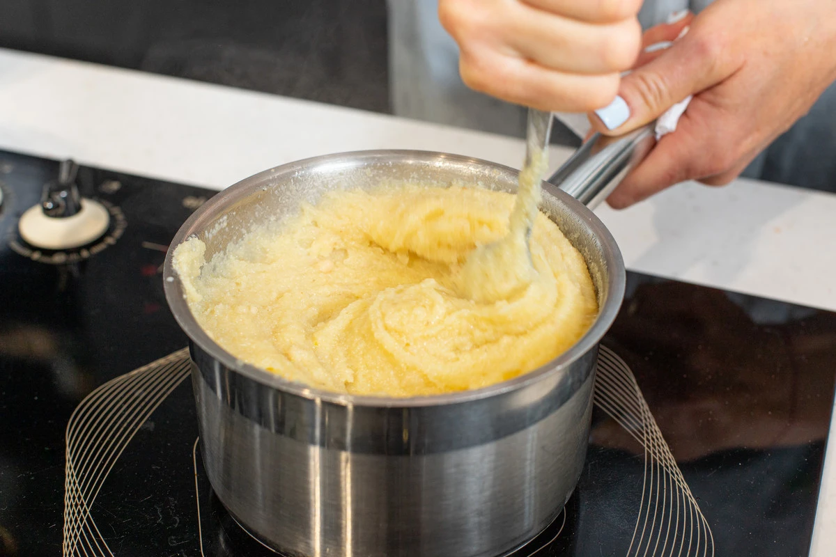 Влейте горячее молоко в манно-масляную смесь и сразу перемешайте, варите 3-4 минуты, помешивая.