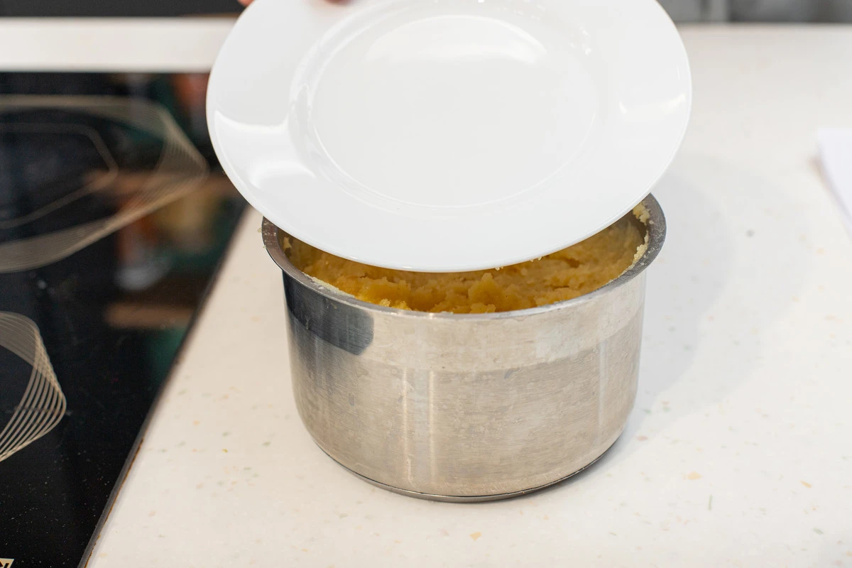 Снимите халвас с огня, накройте крышкой и дайте остыть при комнатной температуре.