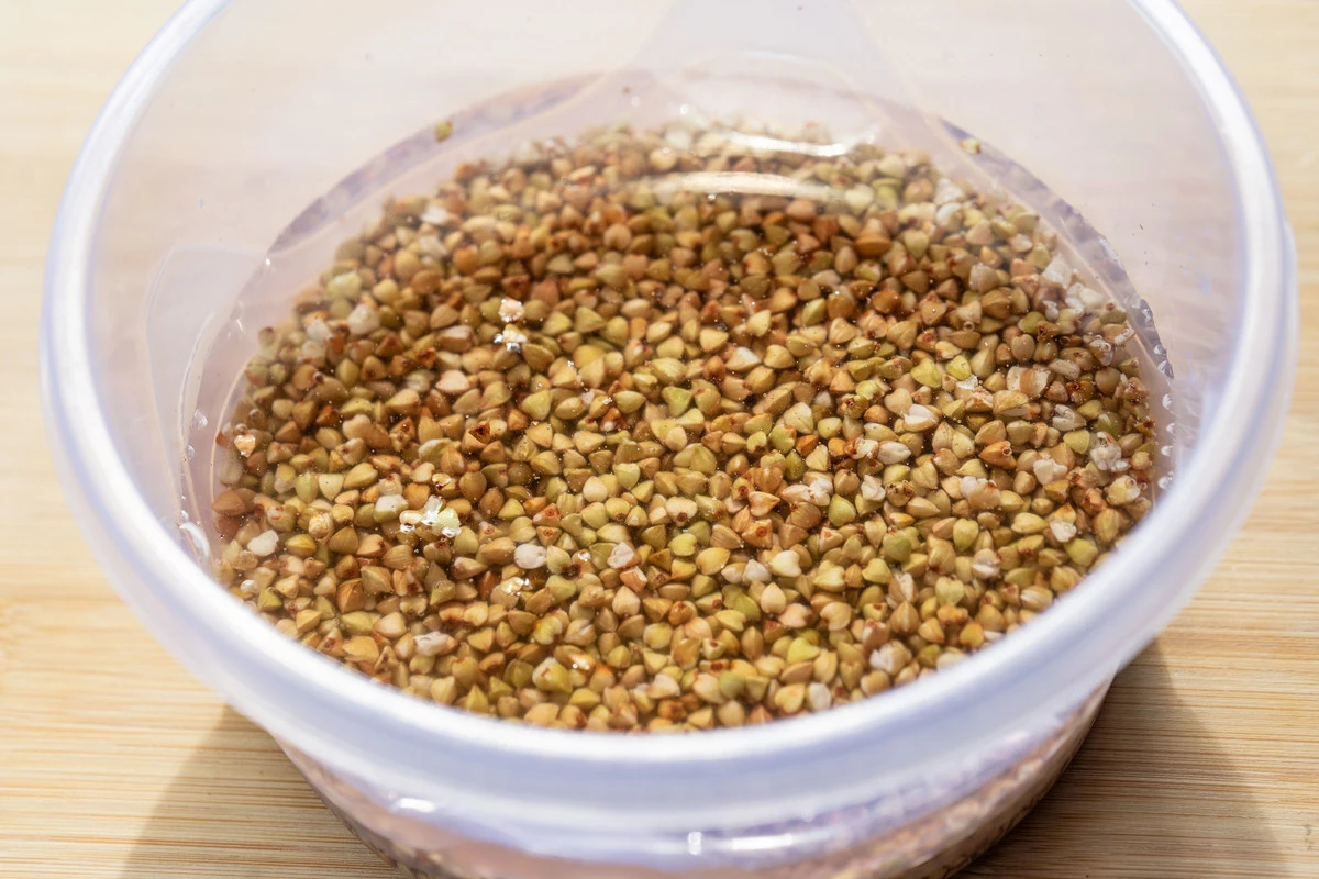 Гречку промойте и залейте водой в контейнере на 1 см выше уровня крупы. Оставьте на несколько часов для набухания. Когда вода впитается до уровня крупы (это произойдёт за 2-4 часа), можно продолжать готовить. Если гречка постояла дольше и воды почти не осталось, долейте до одного уровня с крупой.