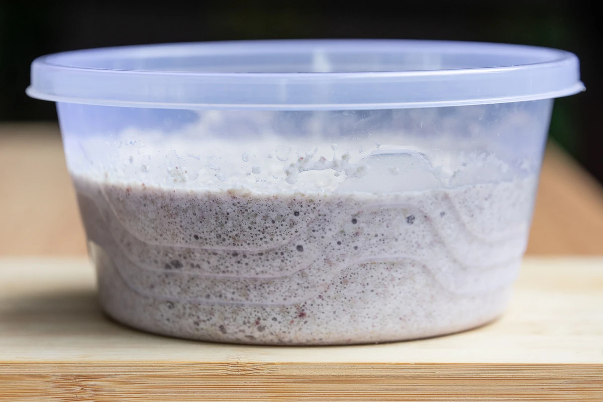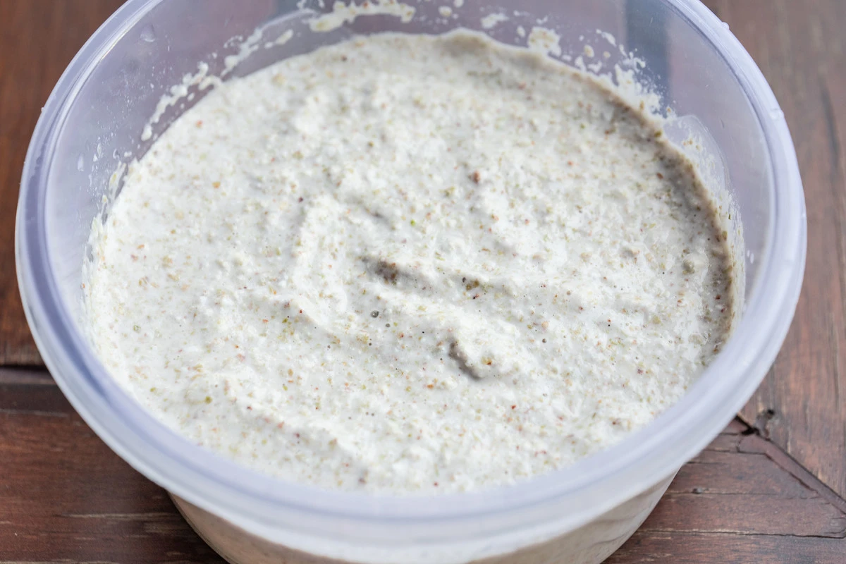 Поместите гречку вместе с водой, в которой замачивали, в блендер, добавьте соль. Пробейте до однородного состояния, тесто должно быть как густая сметана. Переложите в контейнер, накройте полотенцем и оставьте в тёплом месте на ночь.