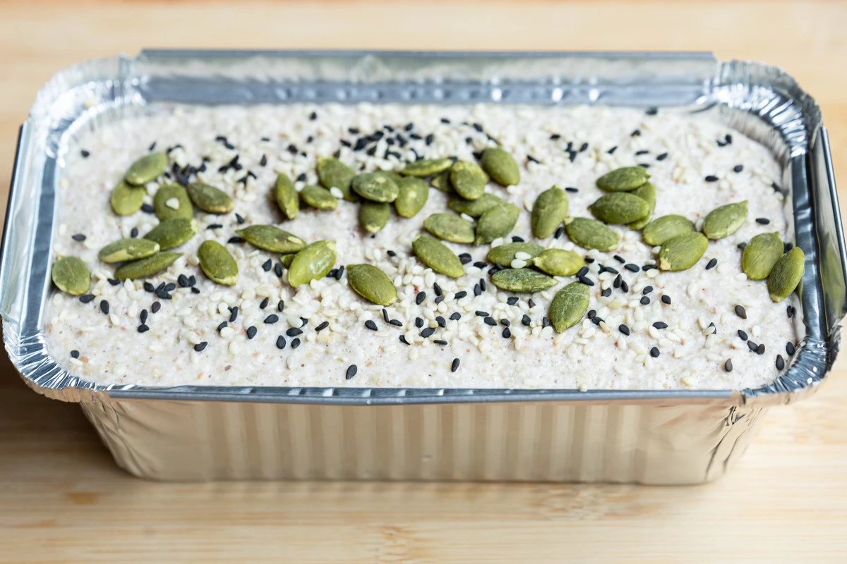 Смажьте форму для хлеба растительным маслом, заполните тестом. Сверху посыпьте семечками тыквы и кунжутом (можно взять любые семечки по вкусу). Выпекайте в духовке около часа. Сначала при 200 °C, когда верх и семечки подрумянятся, убавьте до 180 °C. Проверяйте готовность зубочисткой.