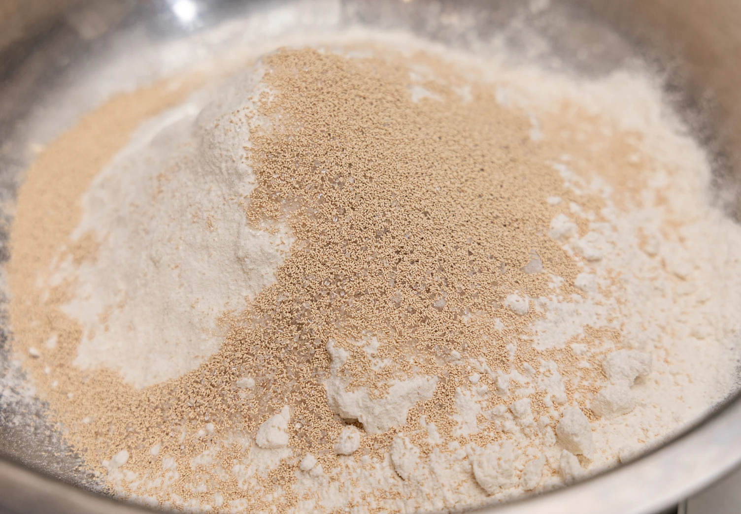 В глубокой миске смешайте половину муки, дрожжи, соль и сахар.