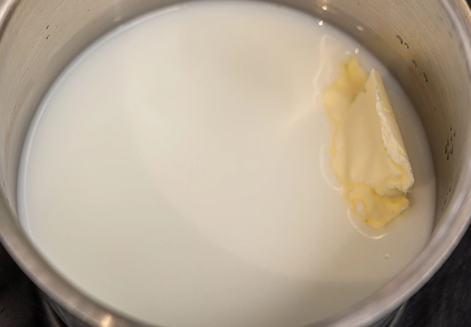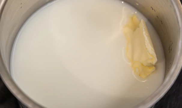 Смешайте молоко и воду, добавьте масло и нагревайте на медленном огне, пока масло не растает.