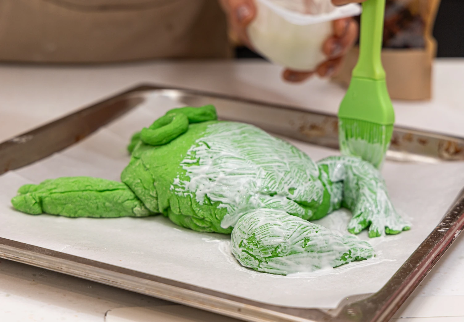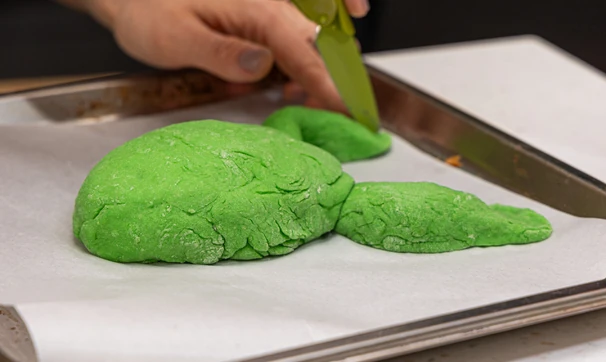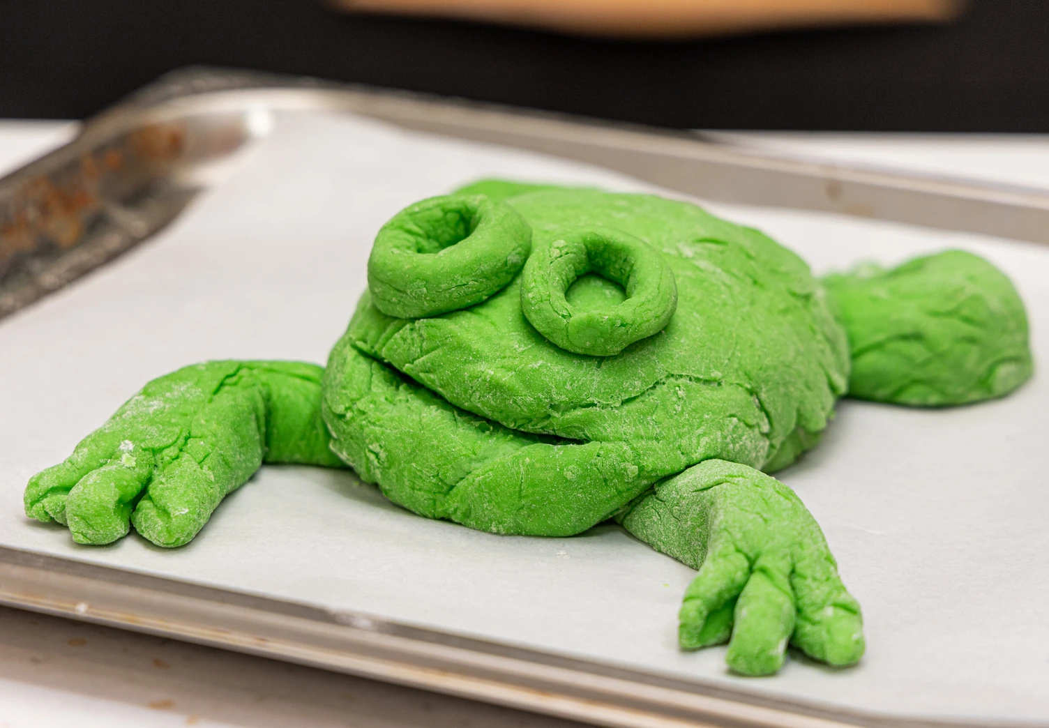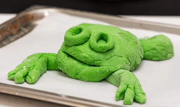 Подошедшее тесто разделите на части: из большей сформируйте округлое тело будущей жабы. Из оставшегося теста сделайте передние и задние лапки, а также глаза.