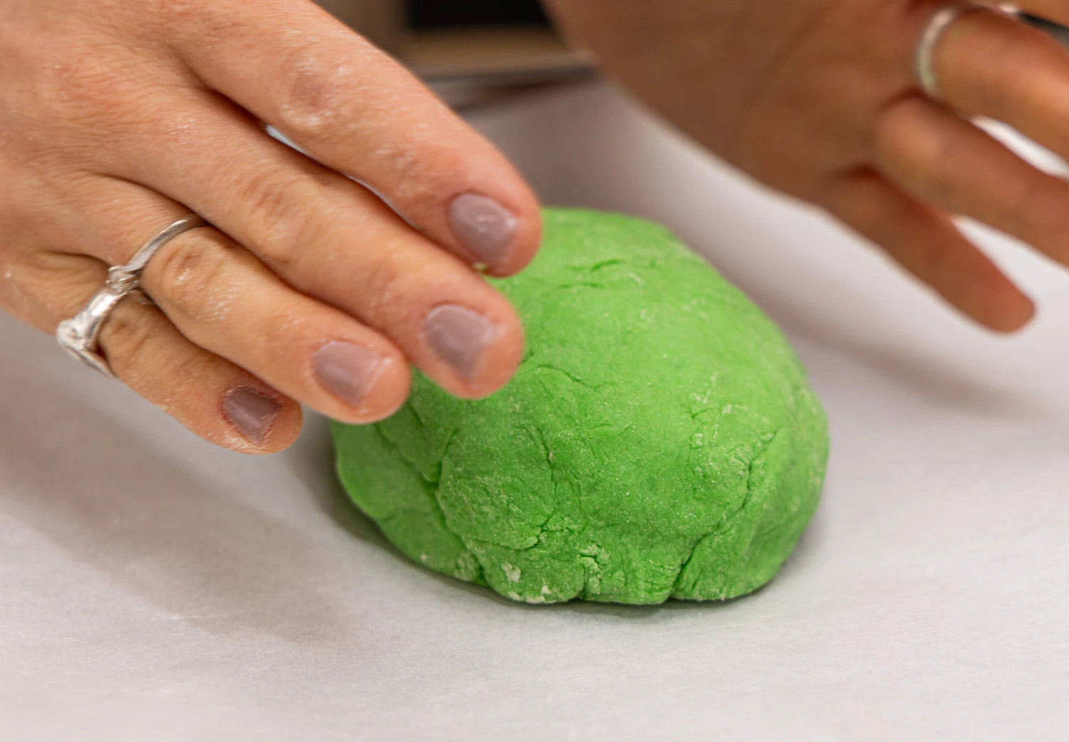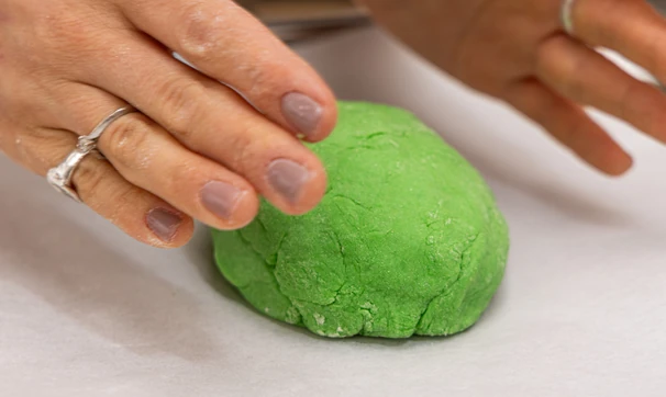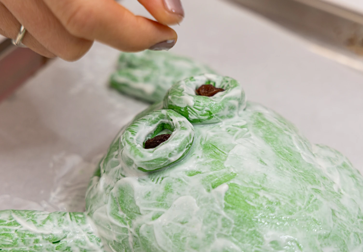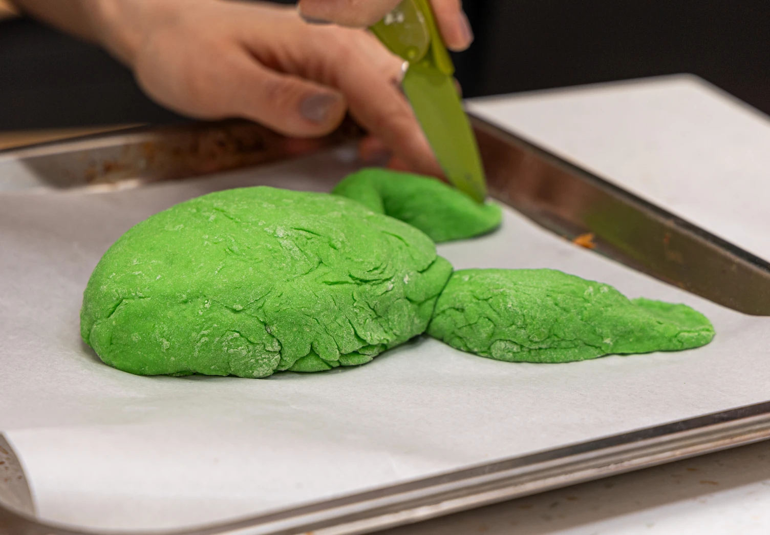 Подошедшее тесто разделите на части: из большей сформируйте округлое тело будущей жабы. Из оставшегося теста сделайте передние и задние лапки, а также глаза.