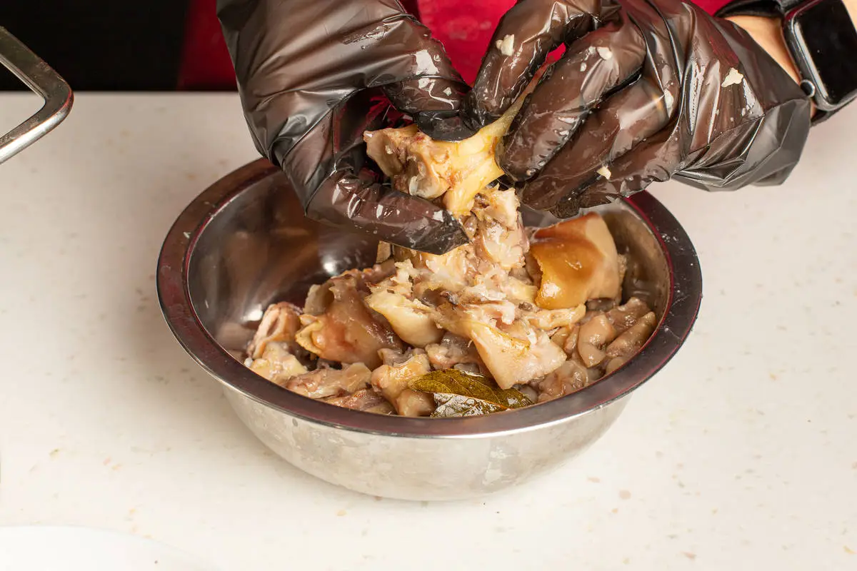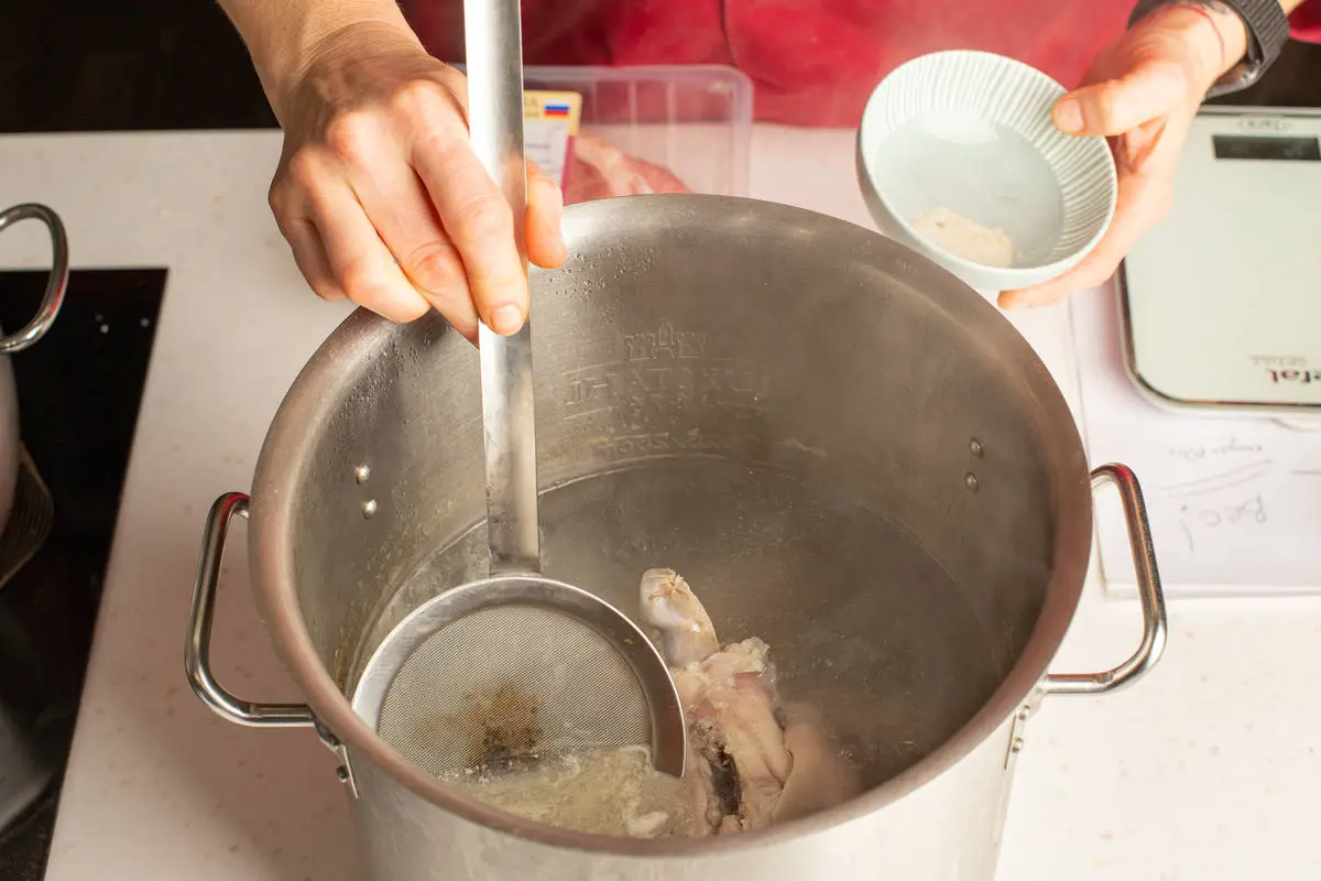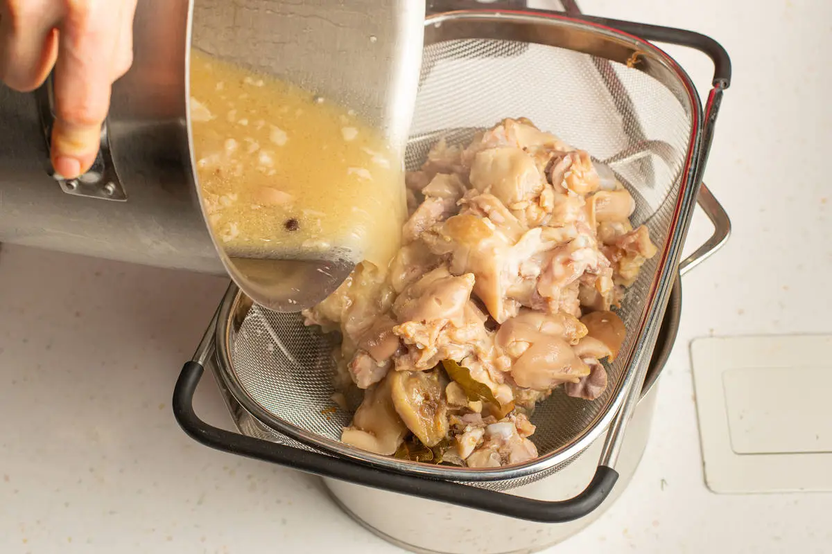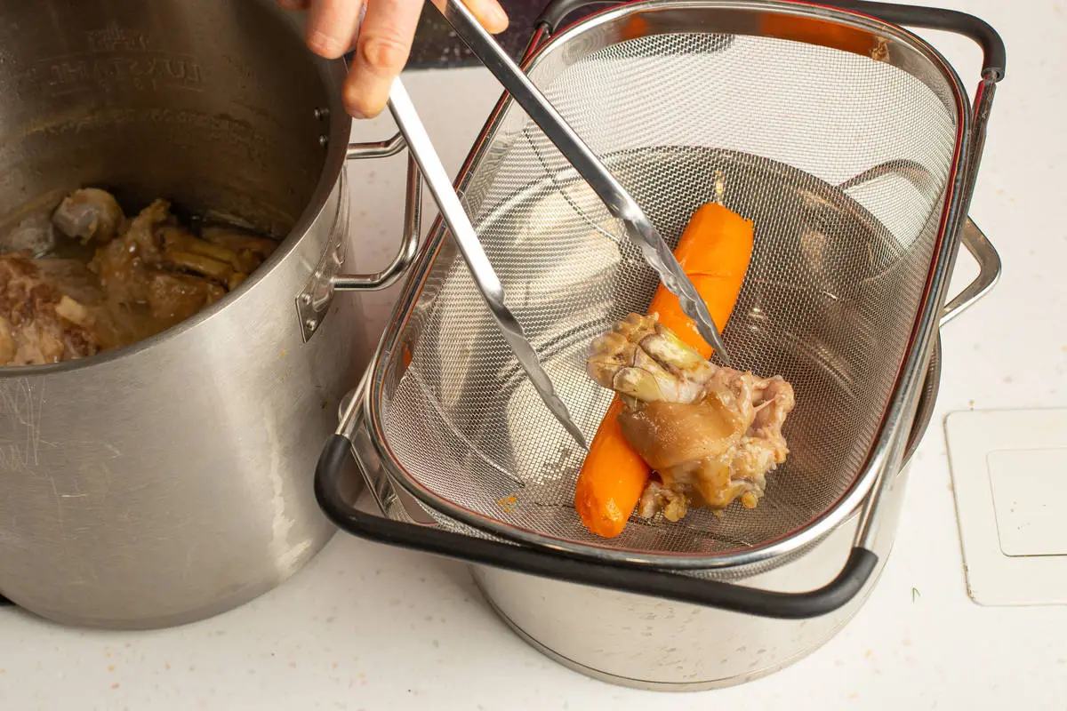 Выньте мясо и ножки из бульона и оставьте остывать. Сам бульон процедите, посолите по вкусу. Овощи тоже выньте. Лук выкиньте, а морковь можно использовать в блюде.