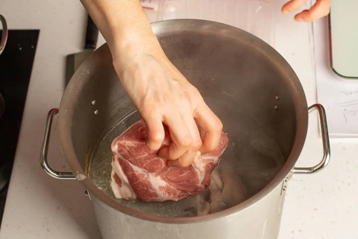 Для большей прозрачности рекомендуем замочить свиные ножки на ночь в холодной воде. С утра воду нужно слить, ножки промыть и поскоблить ножом.