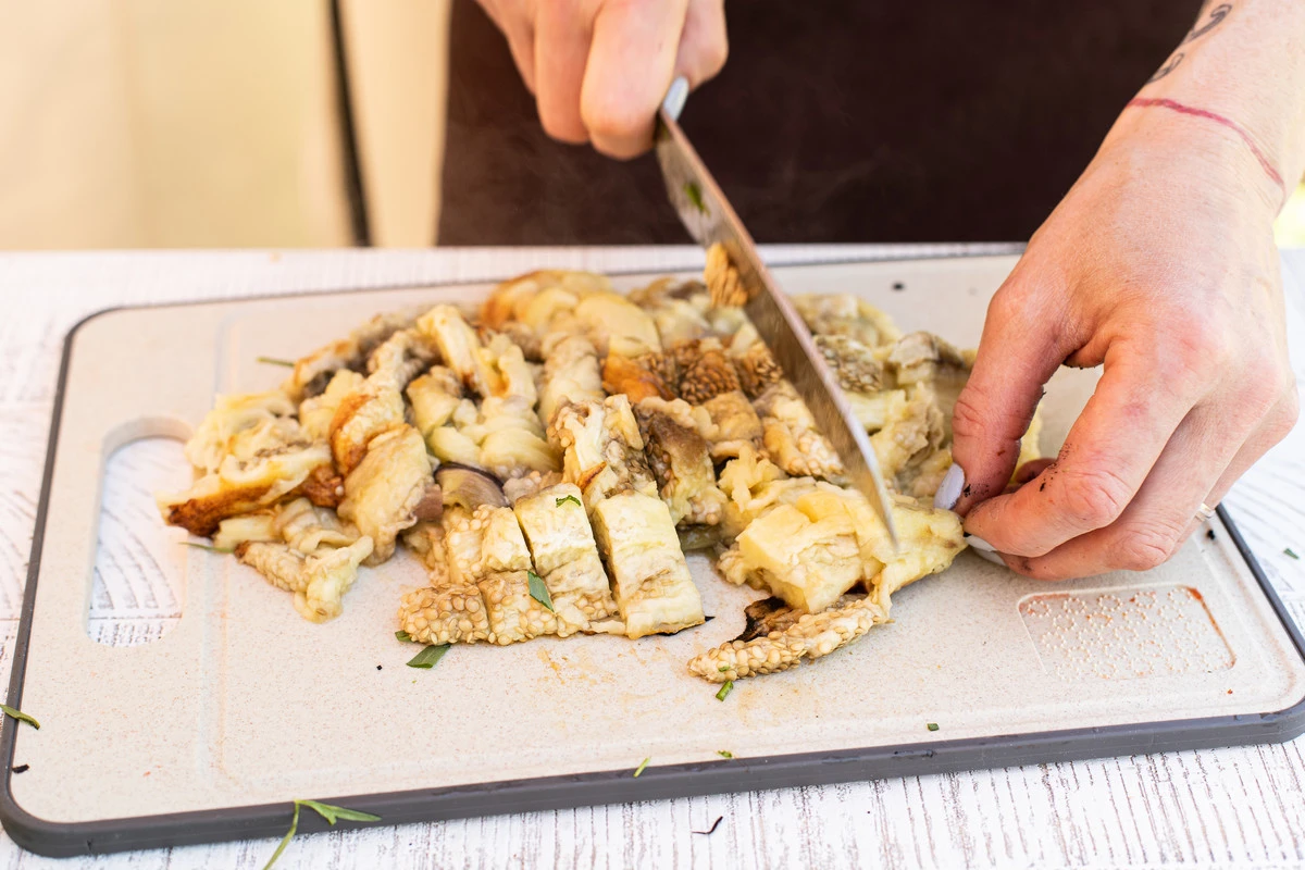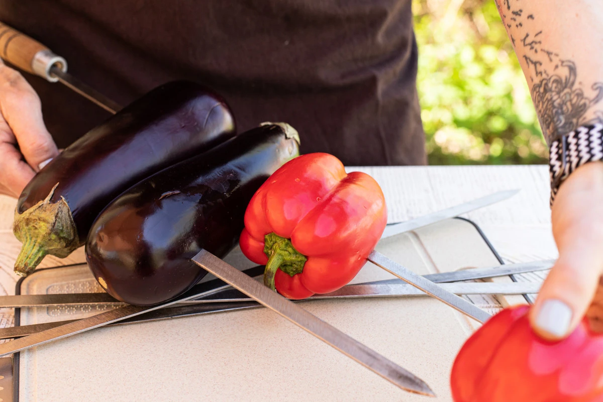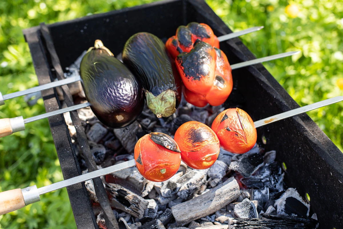Запекайте на углями, переворачивая, пока кожица овощей не почернеет. Томаты будут готовы примерно через 8-10 минут, а баклажанам понадобится чуть больше времени — 15-20 минут.