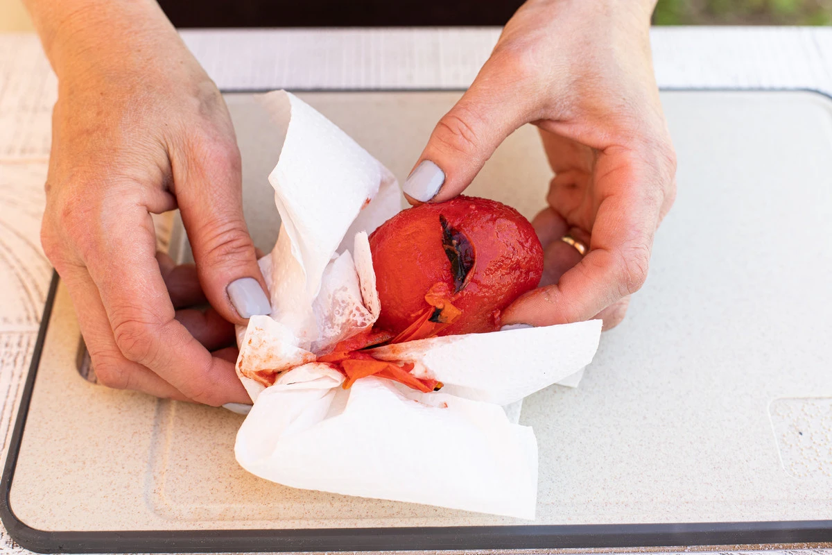 Готовые овощи сложите в контейнер или накройте крышкой, чтобы кожица немного размягчилась от пара. Аккуратно очистите помидоры, перцы и баклажаны от кожицы.