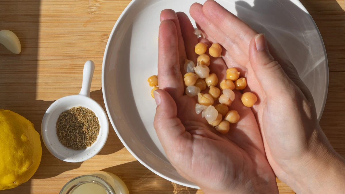 Слегка потрите горсть нута между ладонями, так чешуйки быстро отделятся. Очистите весь нут, удалив верхние чешуйки, они не понадобятся.