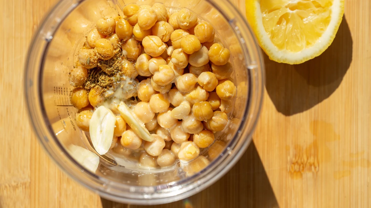 В блендер поместите нут, тахини, оливковое масло, зубчик чеснока (удалите внутренний росток), сок половины лимона, смолотую зиру и соль. Добавьте примерно 50 мл воды от варки нута и измельчите в блендере до консистенции неплотной пасты. Если нужно, добавьте ещё жидкости.