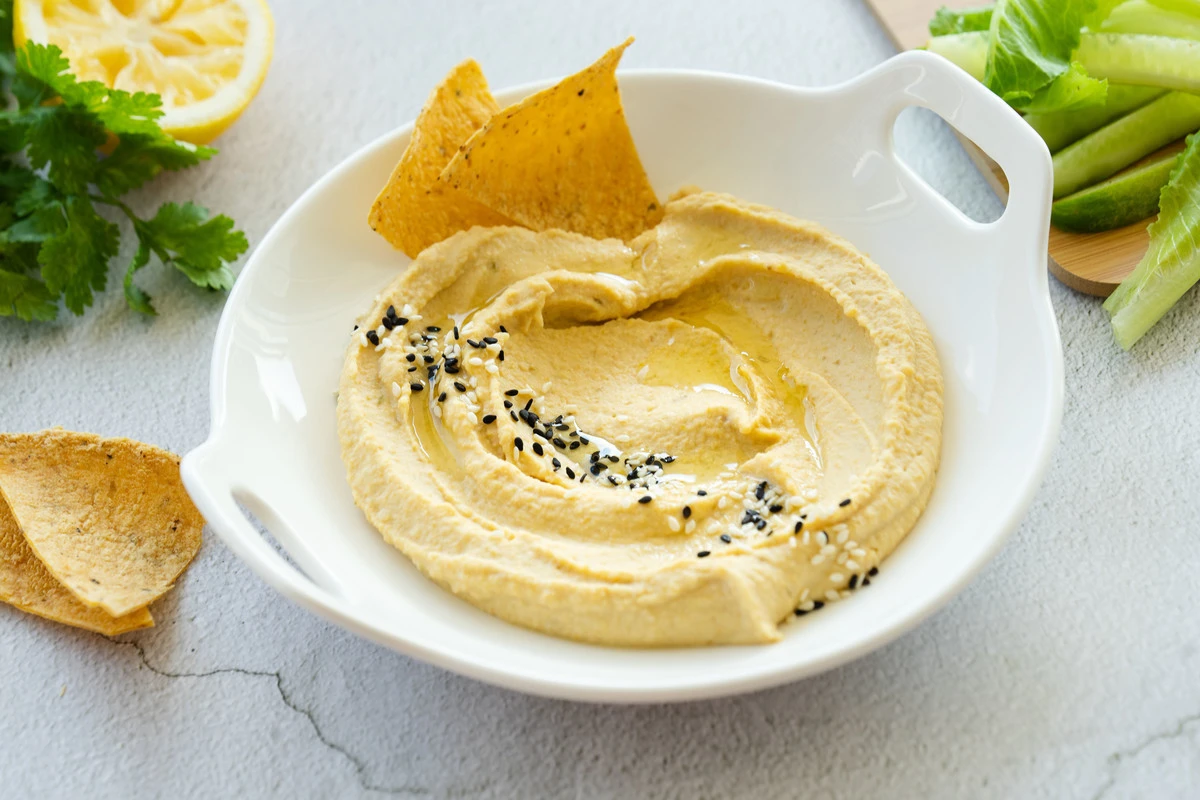Хумус — закуска, которая готовится из нута, кунжутной пасты тахини, оливкового масла, чеснока, лимонного сока и специй. Его можно купить во ВкусВилле или же приготовить дома по этому рецепту.