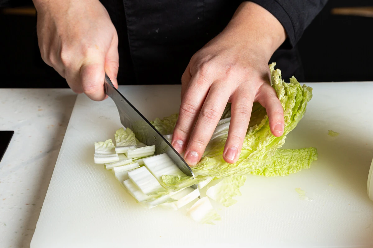 Нарежьте пекинскую капусту шашками (прямоугольниками шириной по 2,5 см).