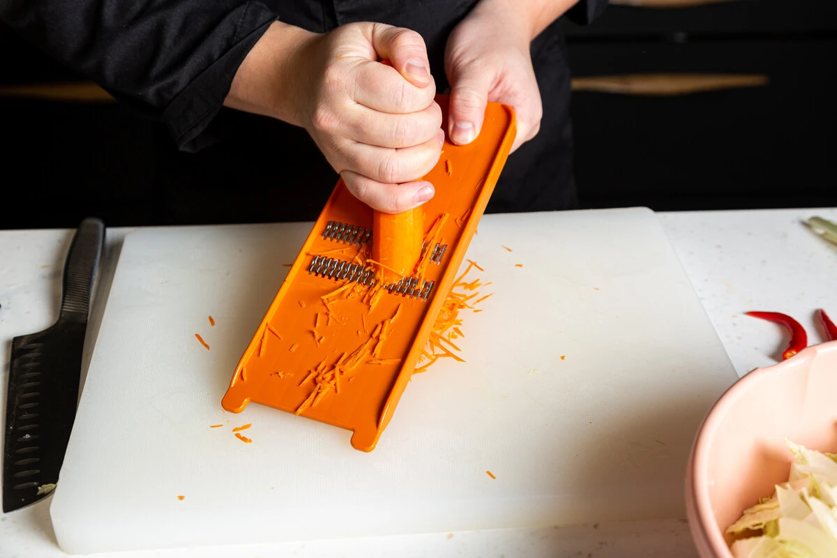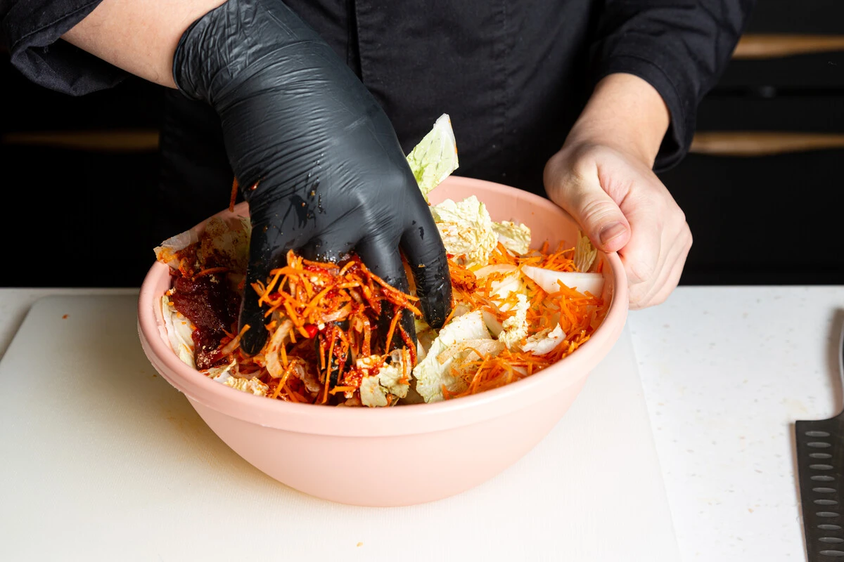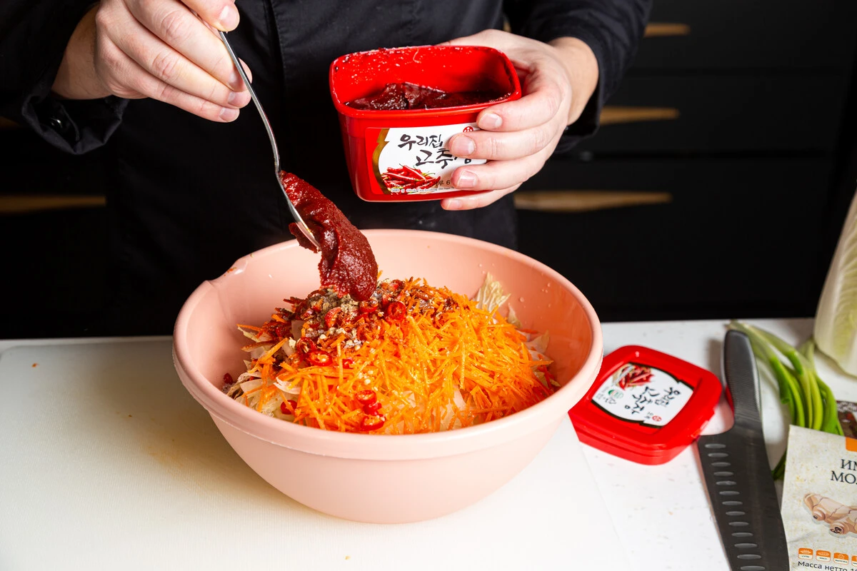Совет: чтобы отрегулировать уровень остроты кимчи по своему вкусу, добавляйте больше или меньше пасты кочудян и тайского перца.