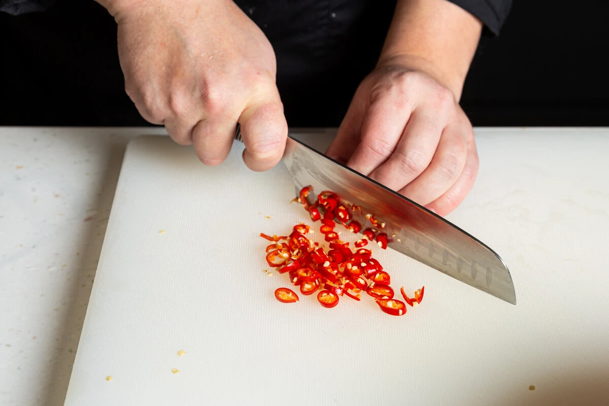 Репчатый лук и тайский перец нарежьте тонкими полукольцами.