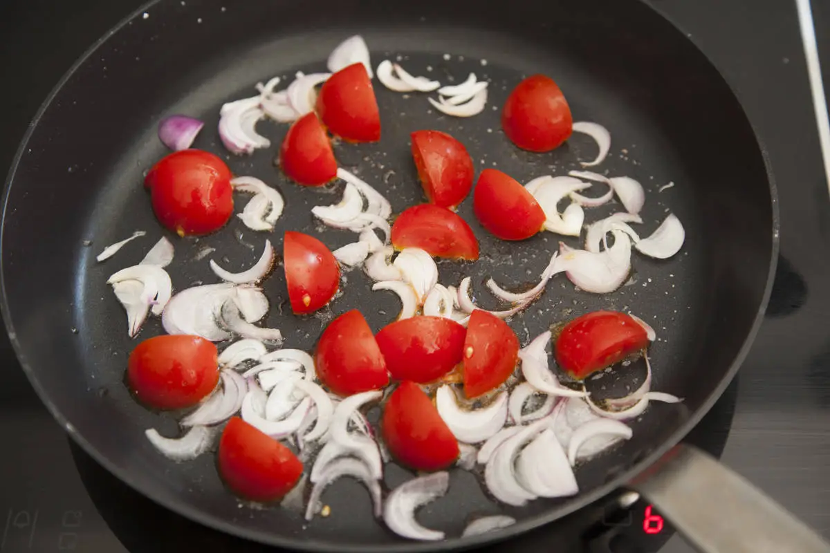 На оливковом масле обжарьте лук и помидоры, выложите на тарелку.