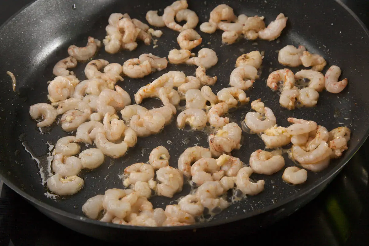 В оставшемся масле быстро обжарьте креветки, помешивая, всего около минуты, уберите сковороду с огня.