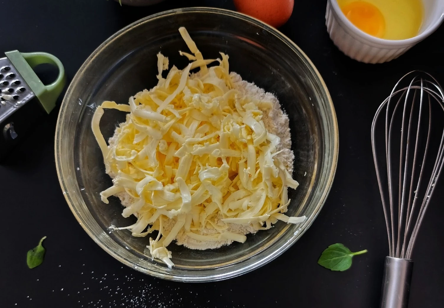 Натрите холодное сливочное масло на тёрке и добавьте его к просеянной муке.