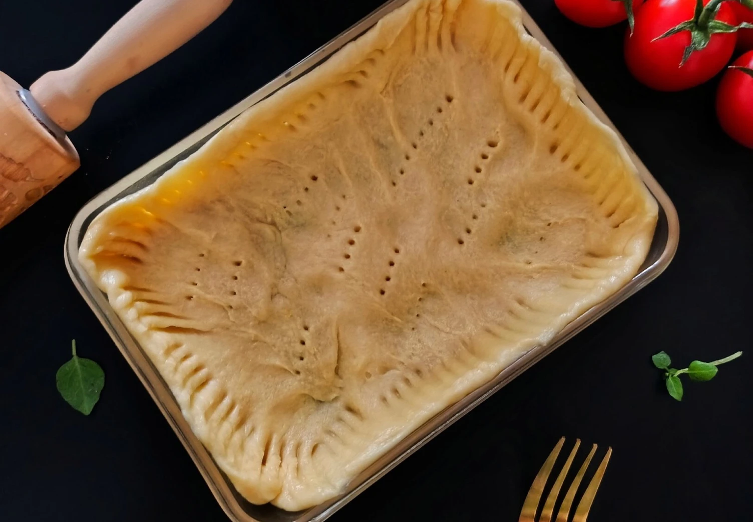 Раскатайте охлаждённое тесто и выложите в форму. Лишнее тесто срежьте ножом. Проколите вилкой тесто в нескольких местах, чтобы оно пропеклось и не пузырилось.