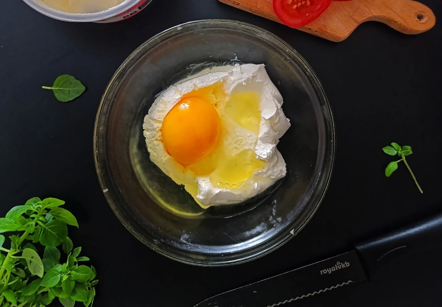 Смешайте яйца и сливки, посолите и поперчите по вкусу. Разрежьте помидоры черри на половинки, натрите сыр крупно.