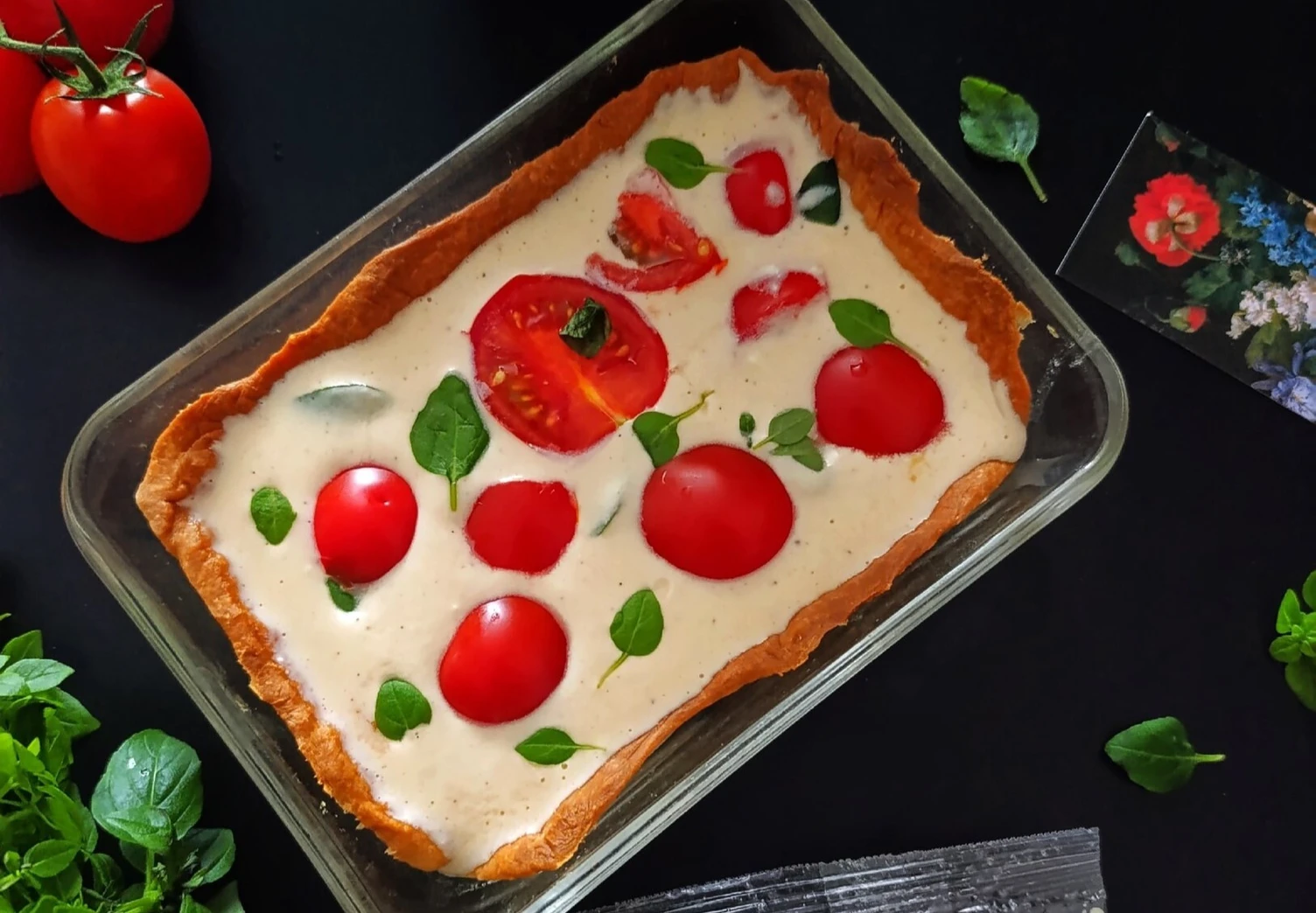 Посыпьте готовый пирог листьями базилика и подавайте горячим, чтобы киш оставался хрустящим.