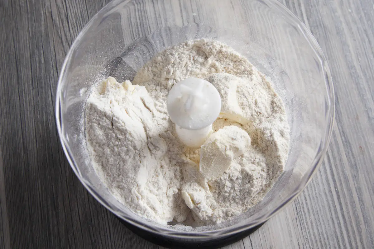 Для теста просто рассыпьте муку и кусочки холодного сливочного масла в чашу блендера и пробейте до состояния крошки.