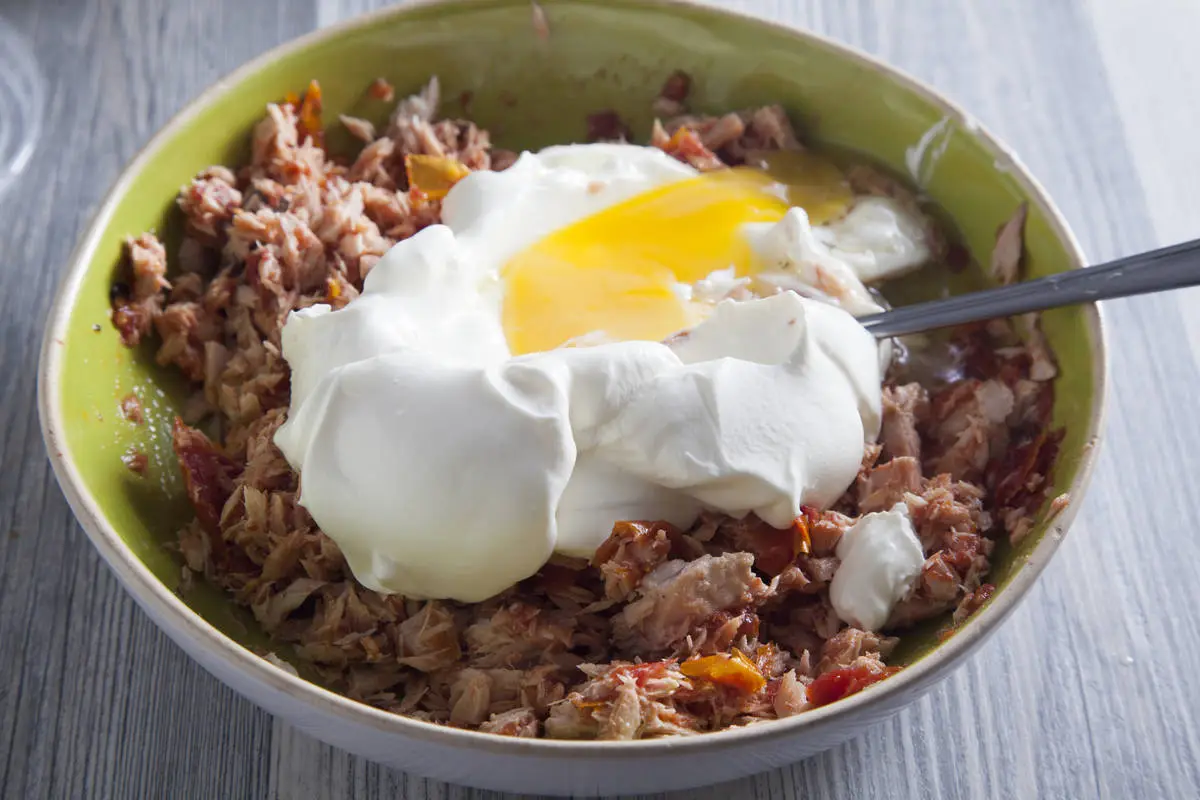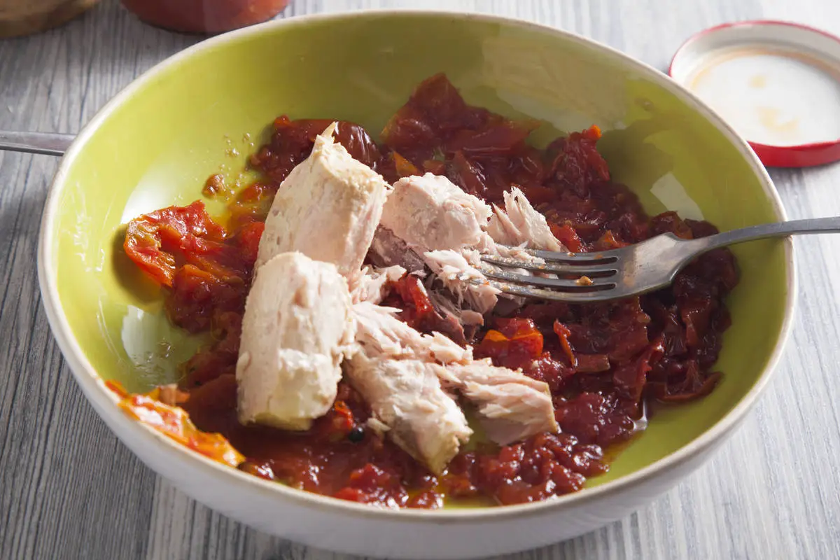 Для начинки разомните кусочки тунца вилкой (жидкость не добавляйте), затем добавьте томаты (без масла), порезанные на кусочки.