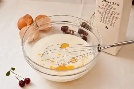 Очень простой пирог — ничего взбивать не нужно, достаточно смешать яйца, молоко, сахар и муку и залить этим тестом вишню. Вынимать косточки из вишни тоже не обязательно, так даже вкуснее!