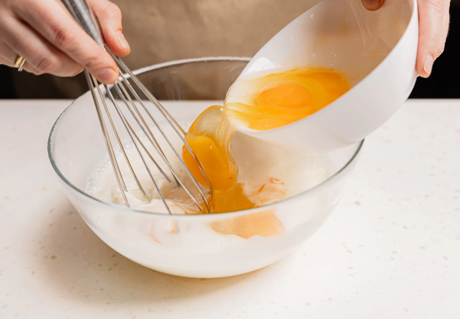 В большой миске смешайте молоко с сахаром венчиком. Добавьте туда яйца и снова перемешайте.