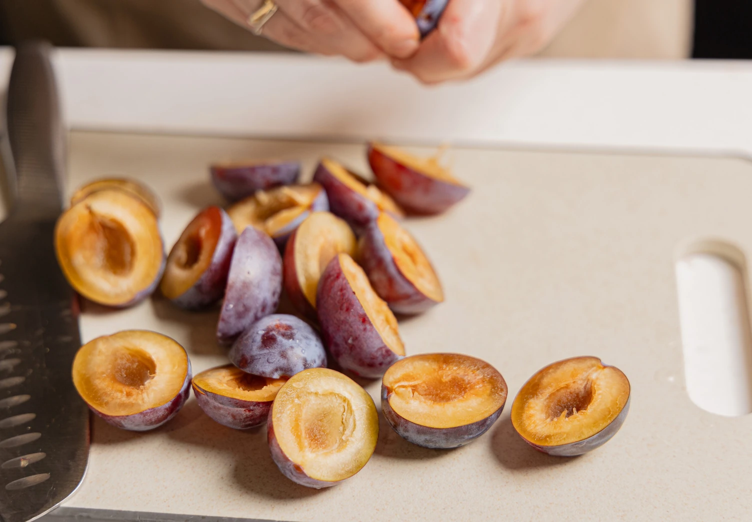 Разрежьте каждую сливу на 2 дольки и удалите косточку.
