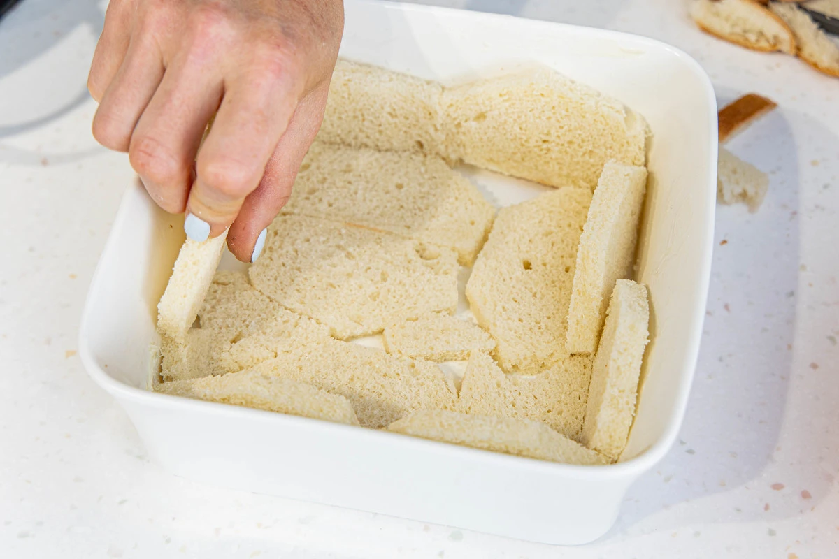 Форму для запекания смажьте сливочным маслом, выложите дно и стенки кусочками хлеба.