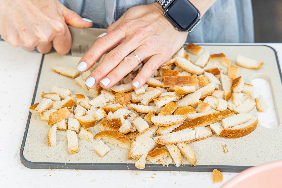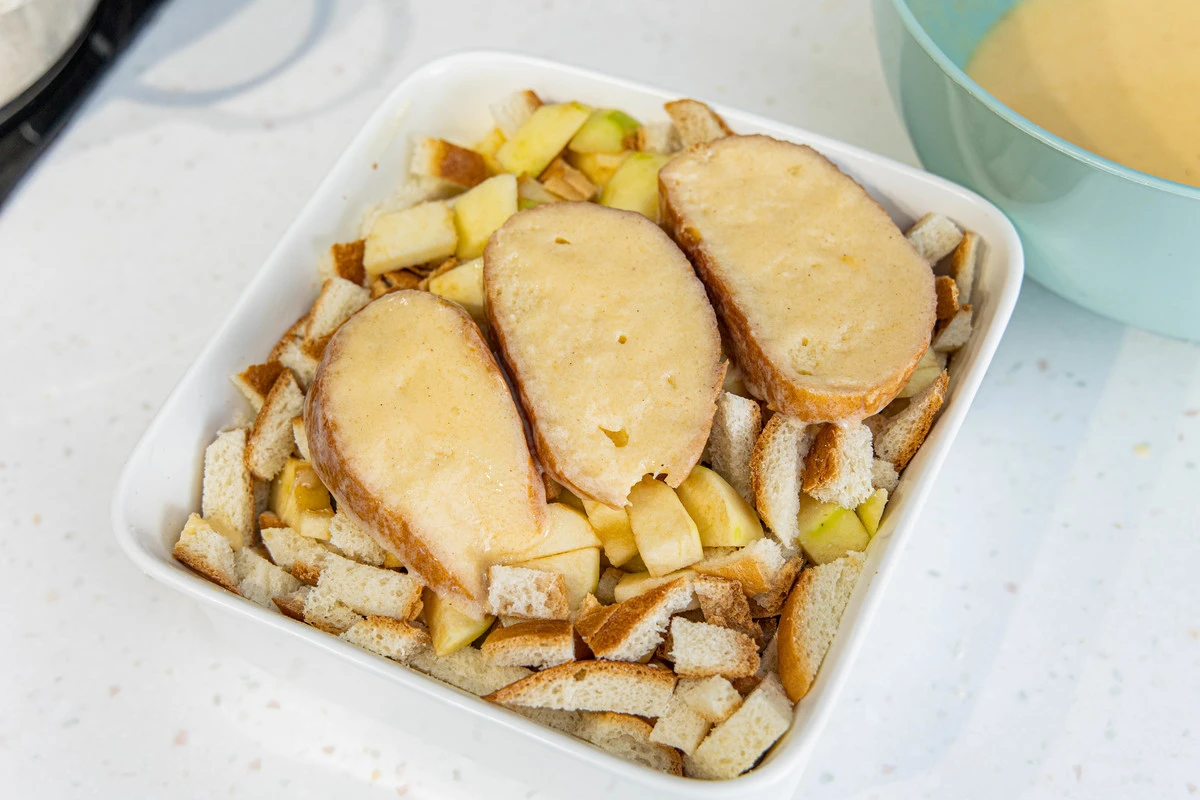 Корочки хлеба нарежьте небольшими кусочками и выложите поверх яблок.
