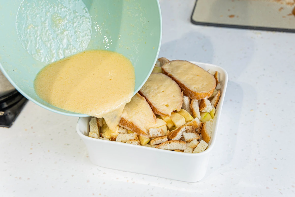 Пропитайте оставшиеся ломтики хлеба смесью кефира, яиц и мёда, выложите сверху.