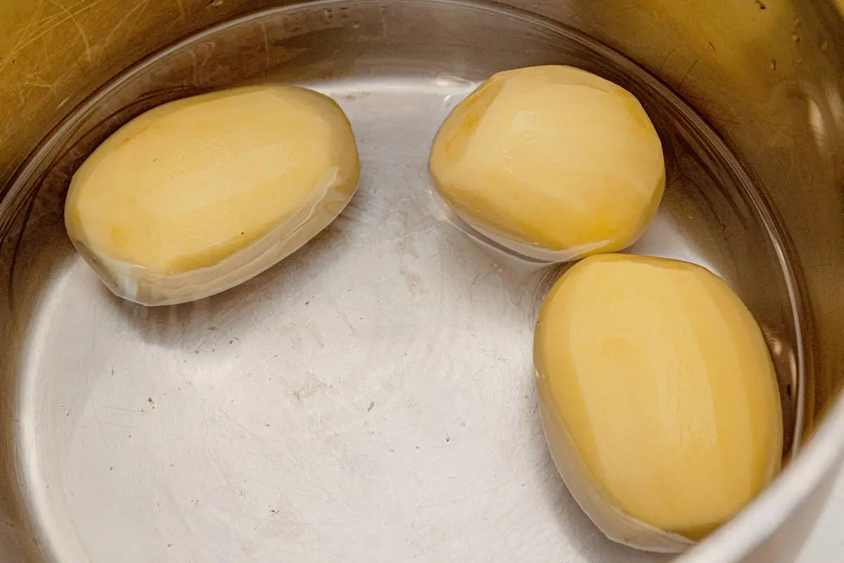 Картофель очистите, отварите до мягкости. Слейте воду и верните кастрюлю с картошкой на плиту на минуту, чтобы выпарить остатки воды.