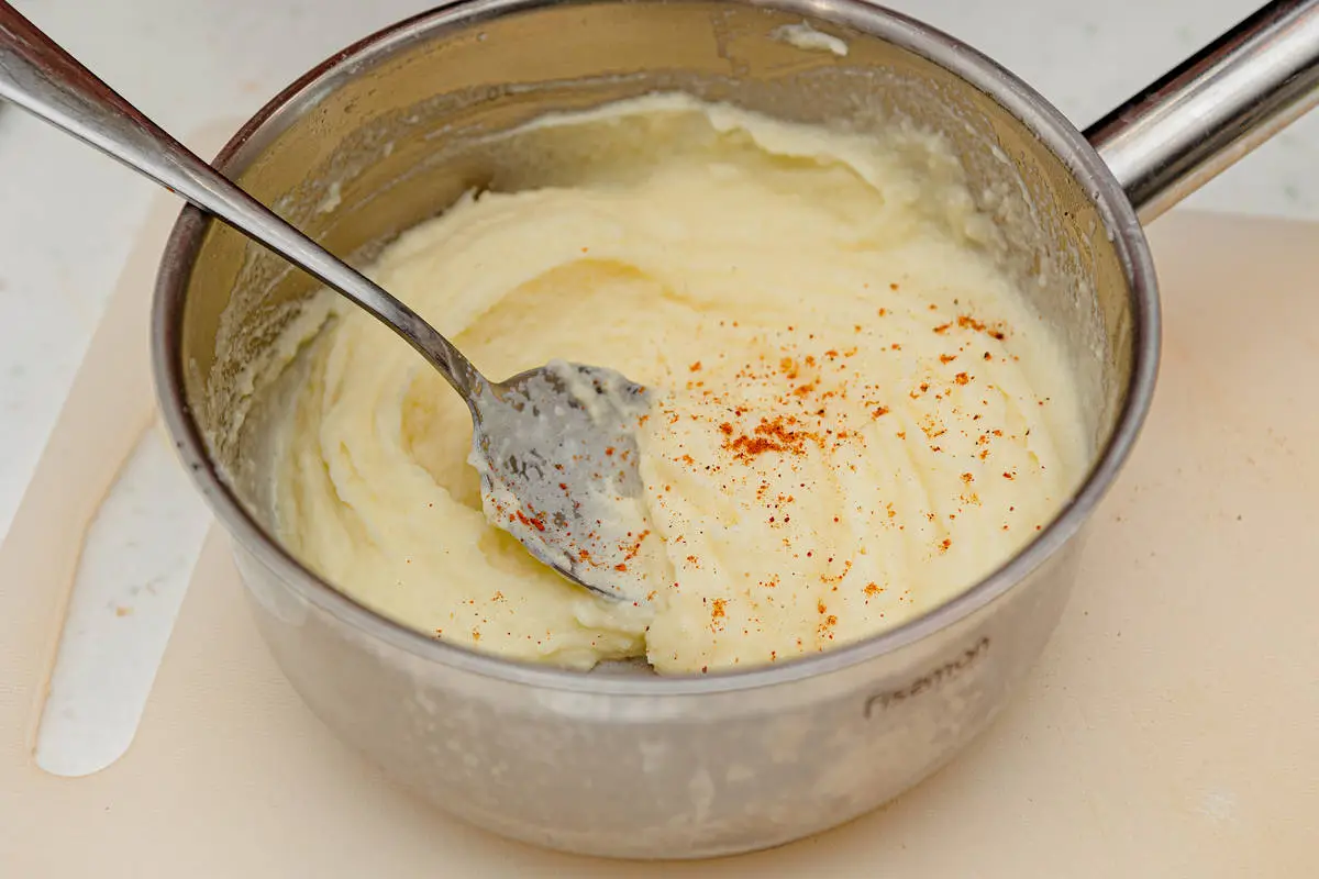 Влейте сливки в протёртый картофель, добавьте соль и мускатный орех, перемешайте.